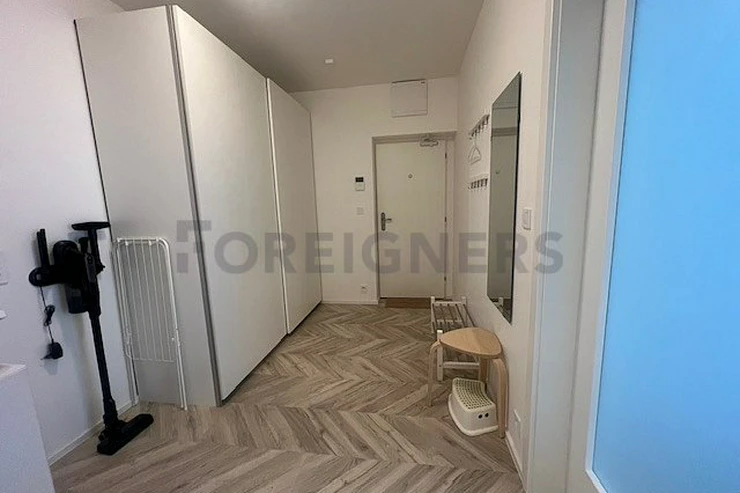 Fully equipped with modern and high-quality furniture such as a comfortable bed, armchair, TV table, built-in wardrobe. Fully equipped kitchen with appliances (oven, hob, fridge) and basic utensils. Large bright hallway with built-in wardrobe, also includes a washing machine.