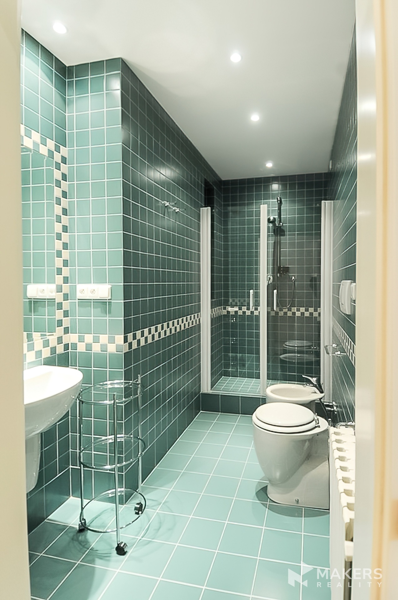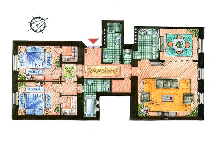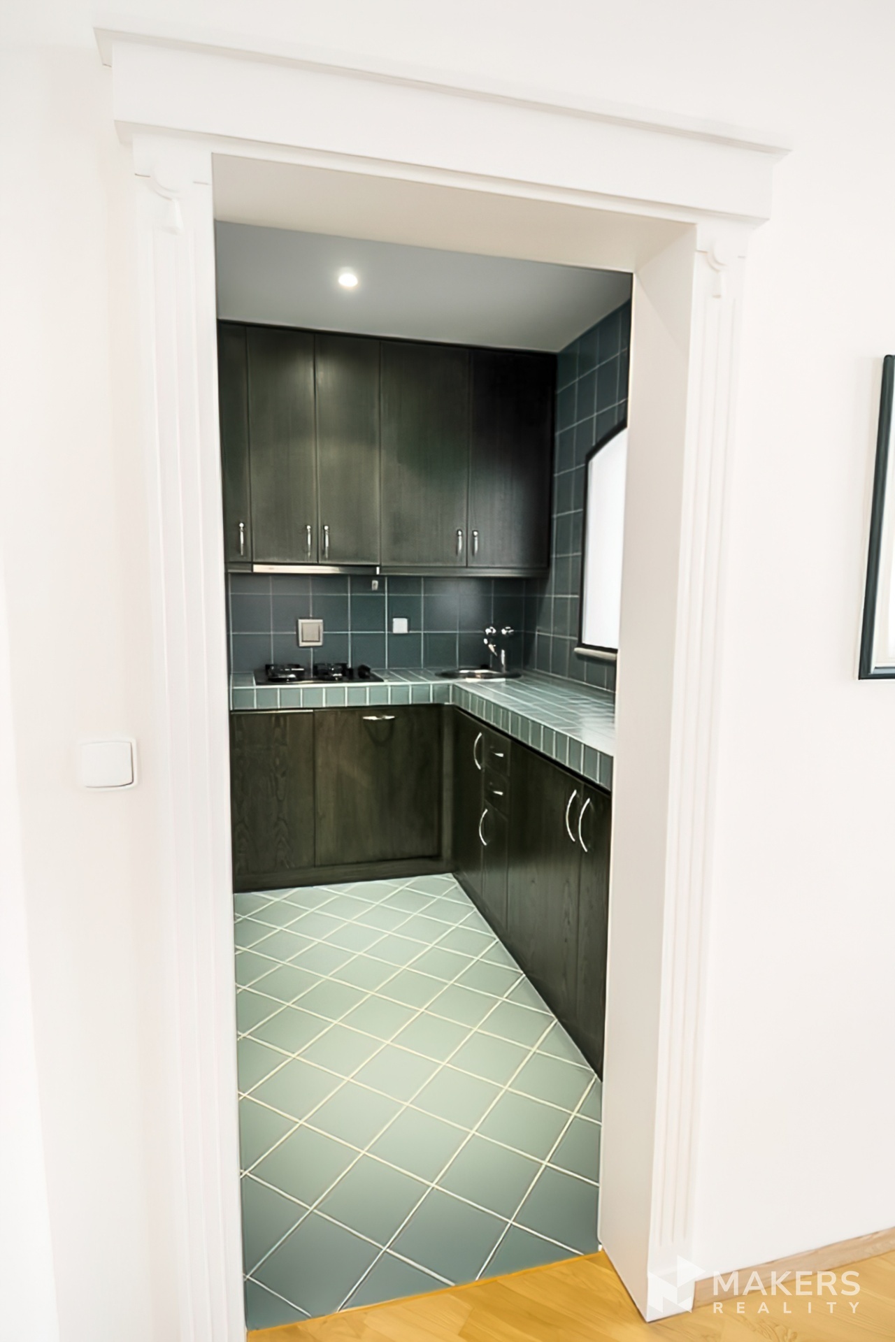 The apartment features an unusual and well-designed layout: it offers two spacious bedrooms, each with its own walk-in wardrobe. There are also two bathrooms — one with a large bathtub and the other equipped with a shower. The kitchen is separated from the dining and living areas. The apartment is fitted with a video intercom, Wi-Fi internet, and satellite connection.