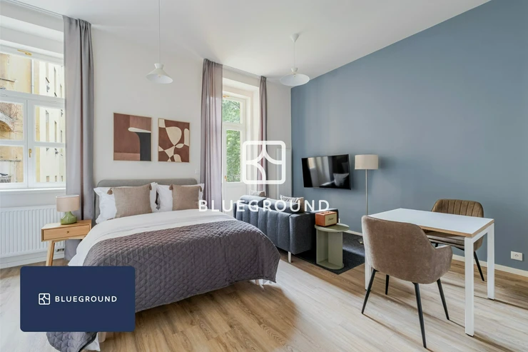Blueground offers a fully furnished studio apartment in the sought-after Holešovice district, available for stays of one month or longer. Located in Prague 7, this well-connected and evolving neighborhood combines residential calm with vibrant city life. The apartment is ideally situated near parks, cafés, and cultural spaces, offering quick access to the city center while maintaining a peaceful local vibe. With its modern amenities and spacious layout, this home is a great choice for professionals, couples, or small families looking for comfort, style, and convenience in one of Prague’s trendiest districts.