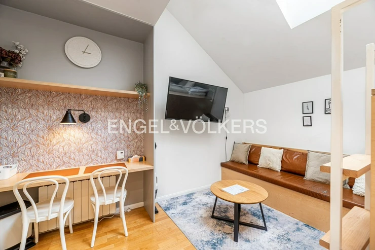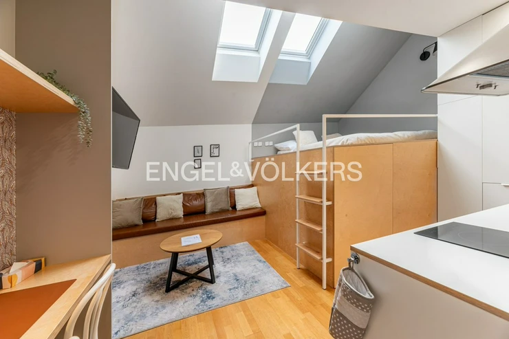 Stylish studio apartment on prestigious Štěpánská Street, right in the centre of Prague. The apartment is located in the attic of a historic apartment building and has been completely renovated.