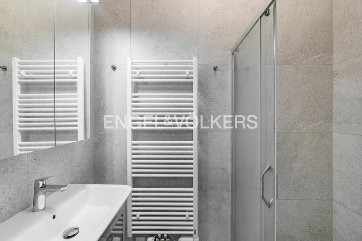 Great layout of the apartment, where from the entrance hall you enter the spacious living room with a kitchenette and a bedroom with a private bathroom. The bedroom is equipped with a large double bed and an en-suite bathroom with shower and sink. The toilet is separate. The living room is equipped with a sofa, dining table, TV and storage space in the form of wooden and glass cabinets.