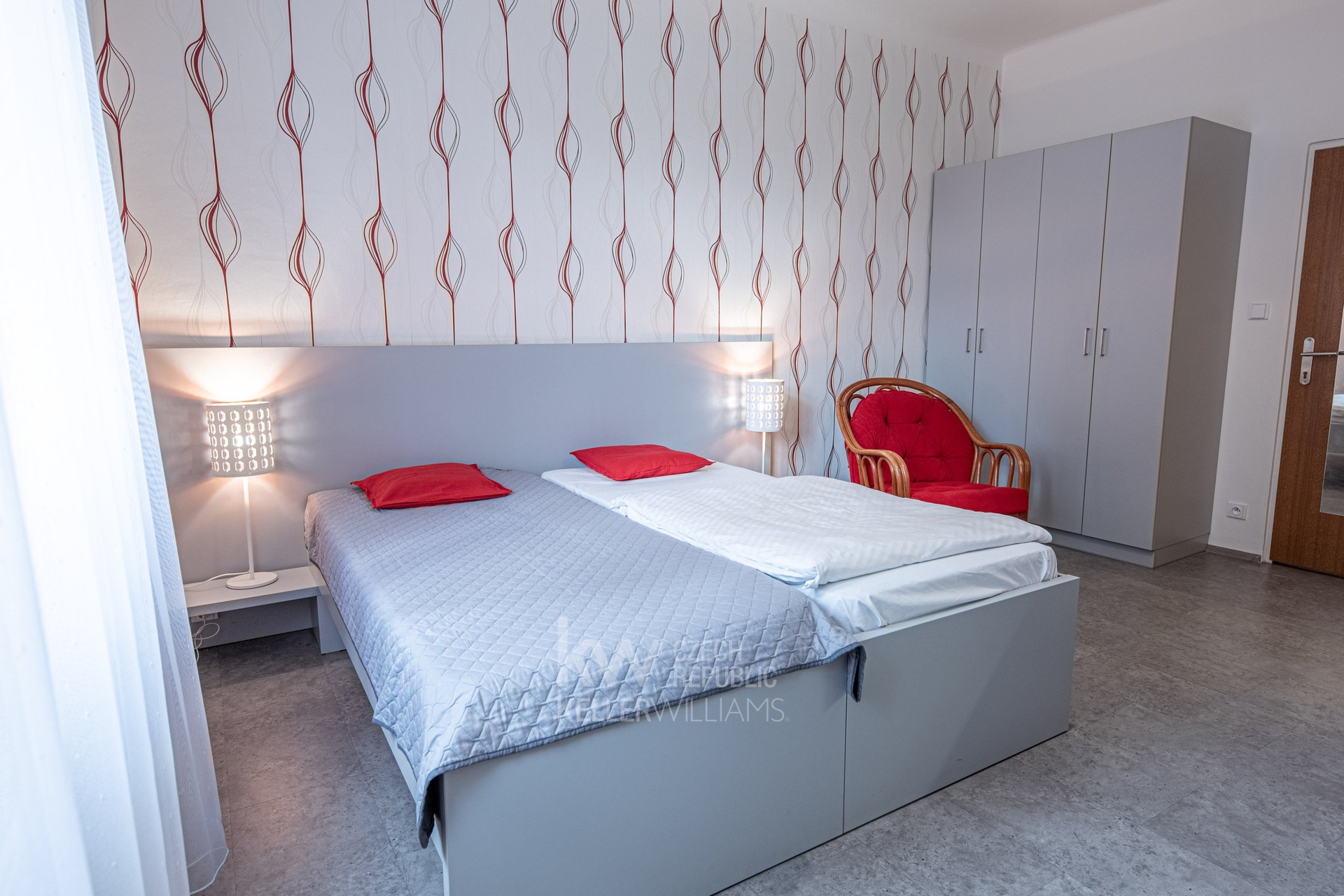 In a beautiful First Republic villa, for rent a fully equipped studio just next to the park and the theater Na Jezerce. The studio is equipped with a kitchen including a refrigerator & freezer, hob, and basic kitchen equipment (cutlery, plates, etc.). The bathroom has a shower, toilet, and a hairdryer. The room itself is equipped with a wardrobe, satellite TV, WIFI connection, table, chairs, and bed. Note: photos may be illustrative; the house contains apartments of the same standard.
