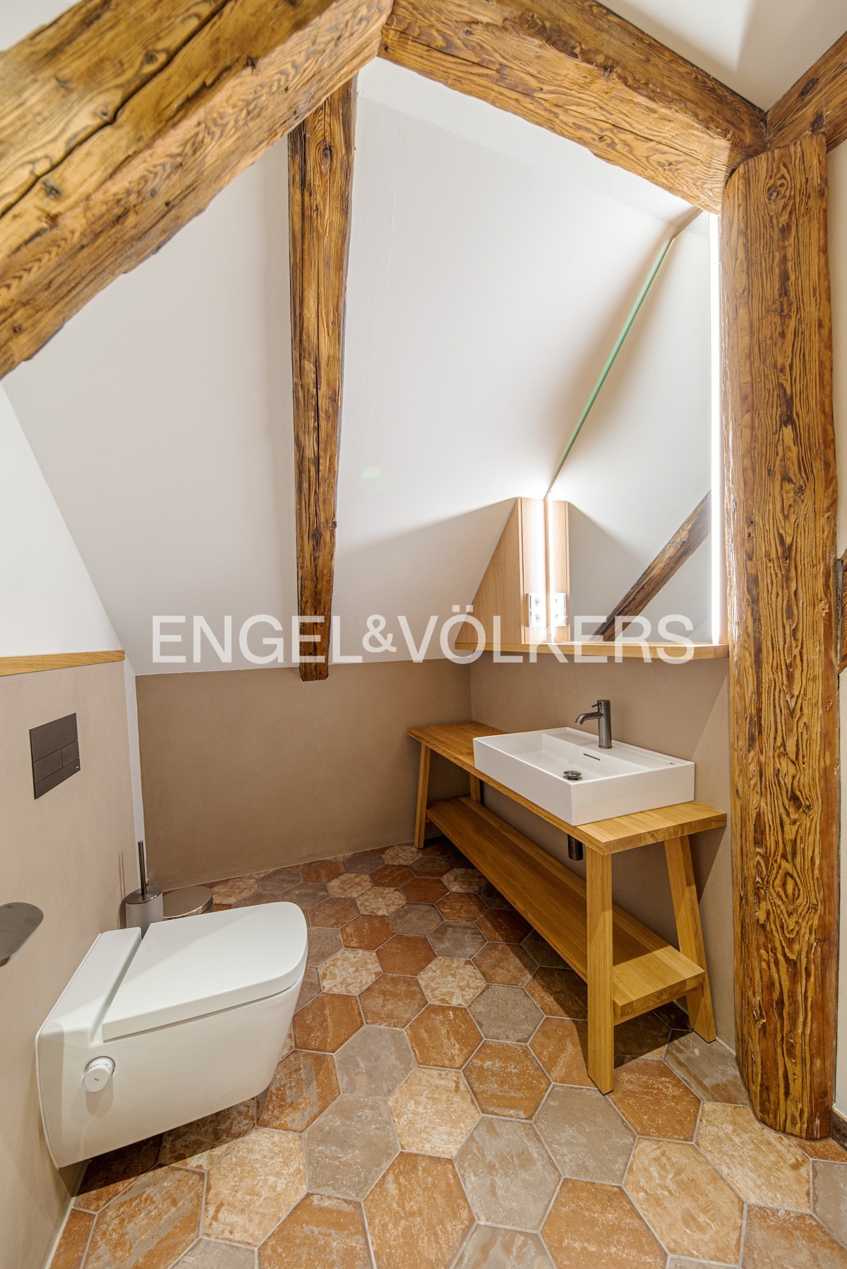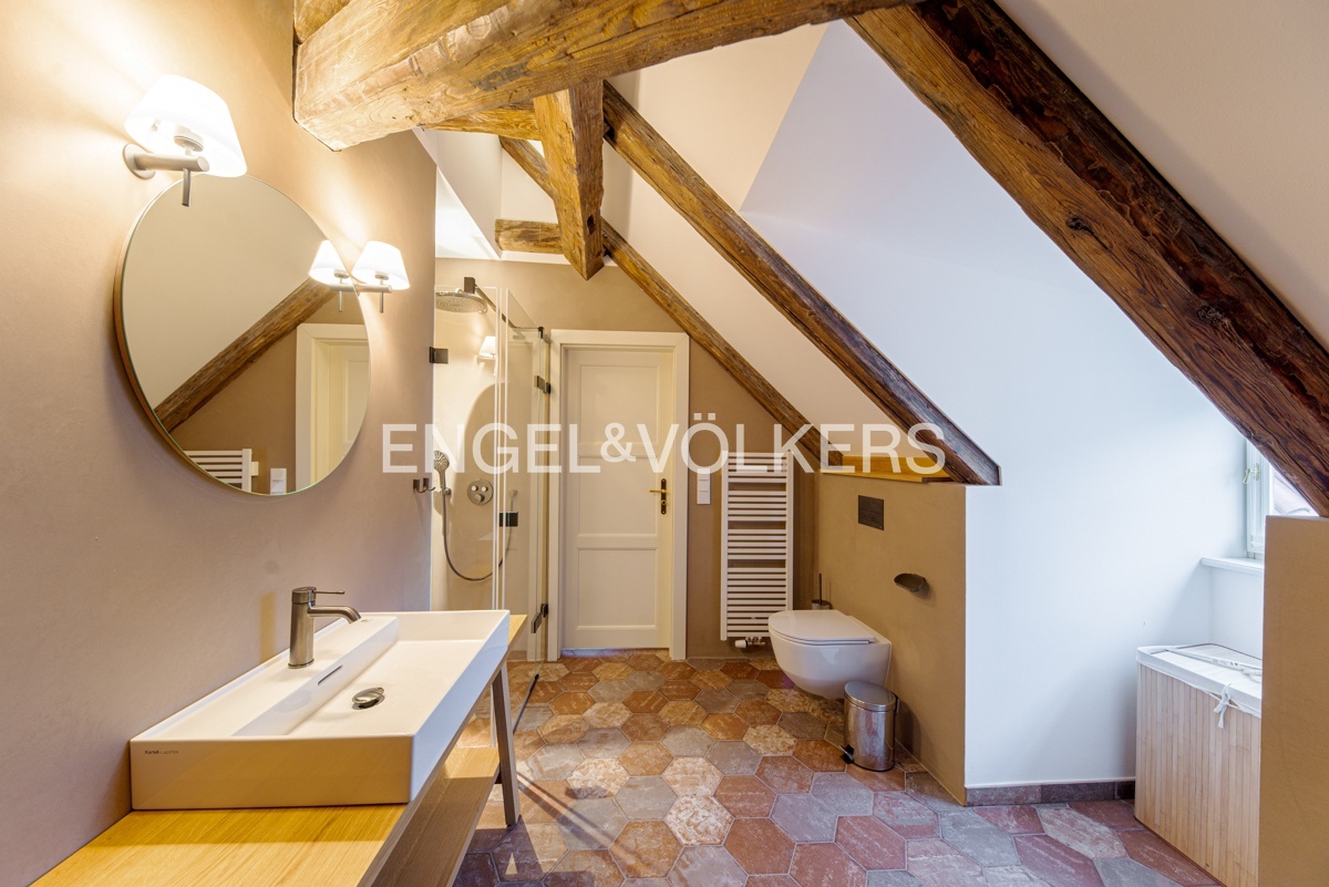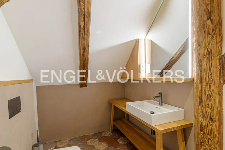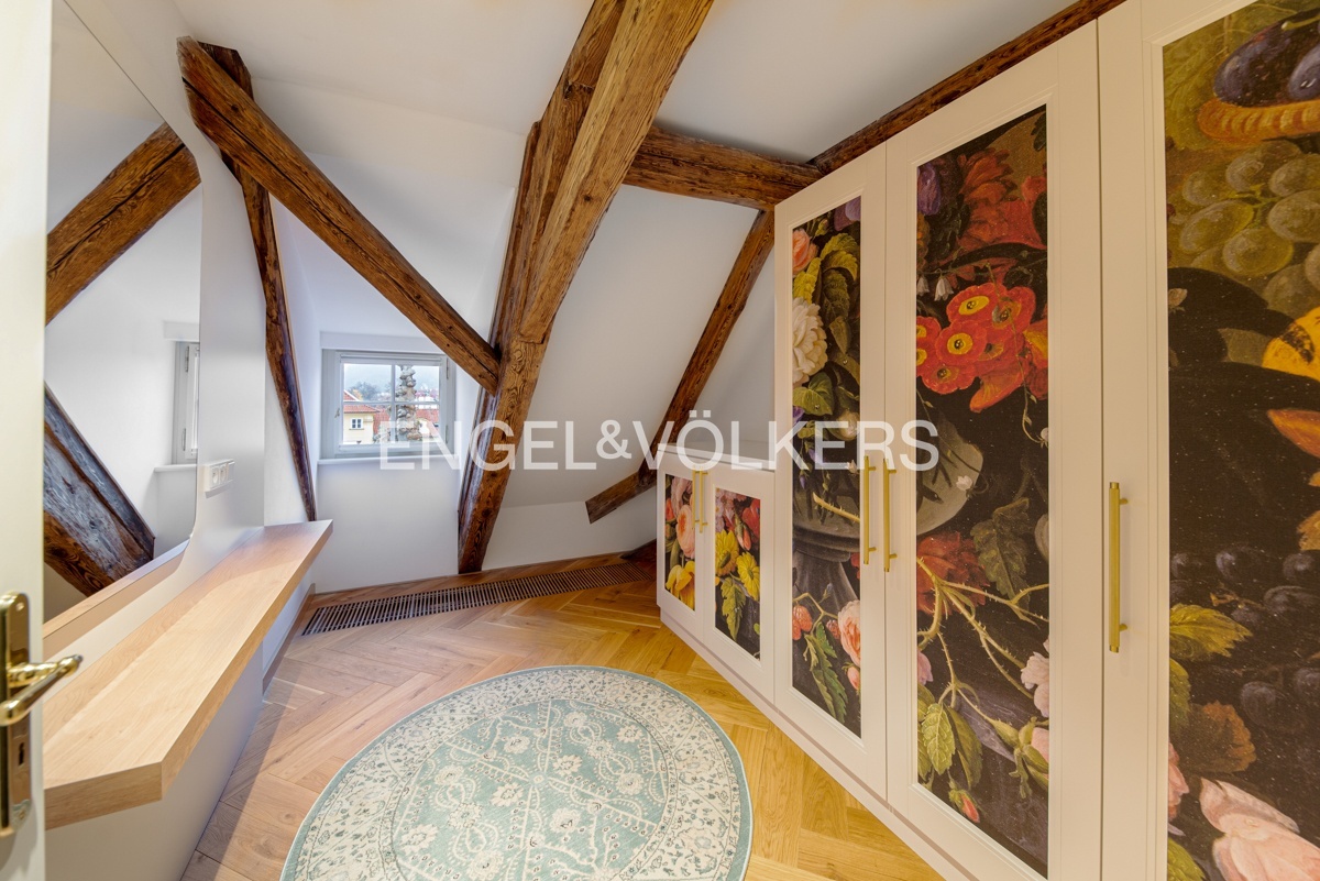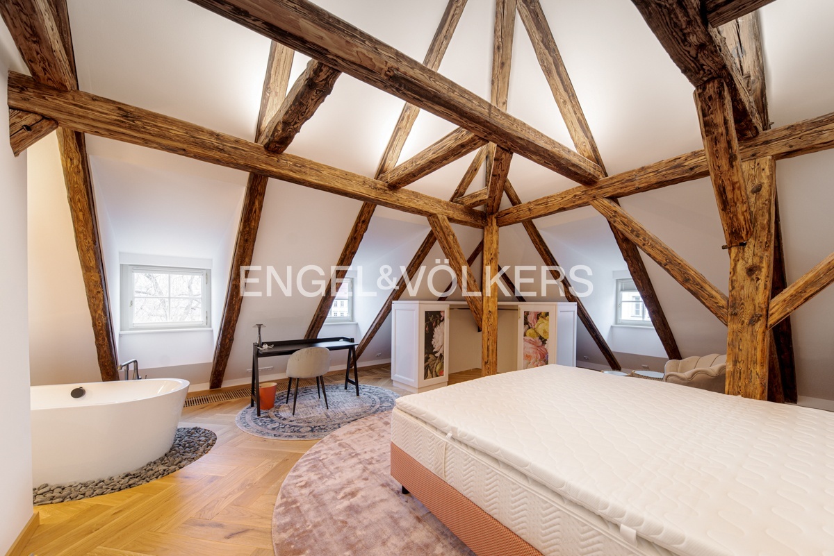Unique layout with a separate bedroom with built-in wardrobe and en-suite bathroom, beautiful freestanding bath with views of the Petrin Hill, generous living room, kitchen, utility room and guest toilet and cloakroom.