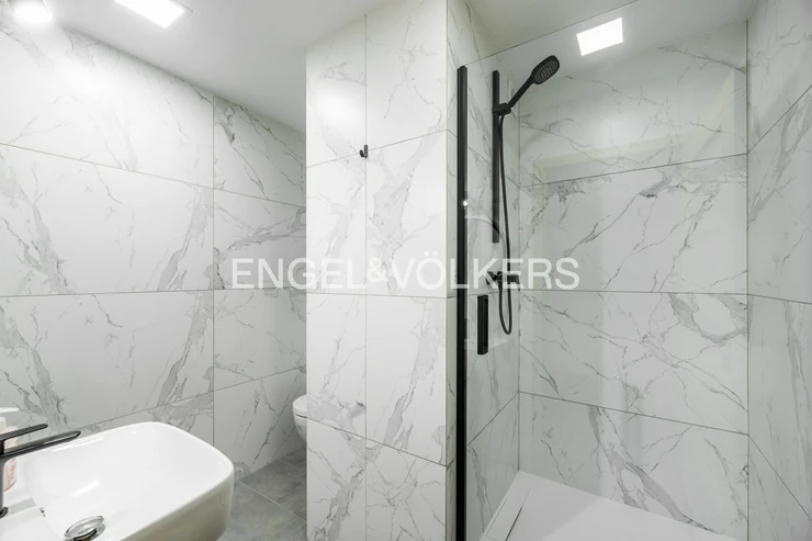 The apartment has undergone a complete reconstruction and is ready for immediate move-in. The layout consists of a living room with a kitchenette, a separate bedroom, a hallway, and a bathroom with a shower. The kitchen unit is fully equipped with all appliances, including a dishwasher, and provides plenty of working and storage space.