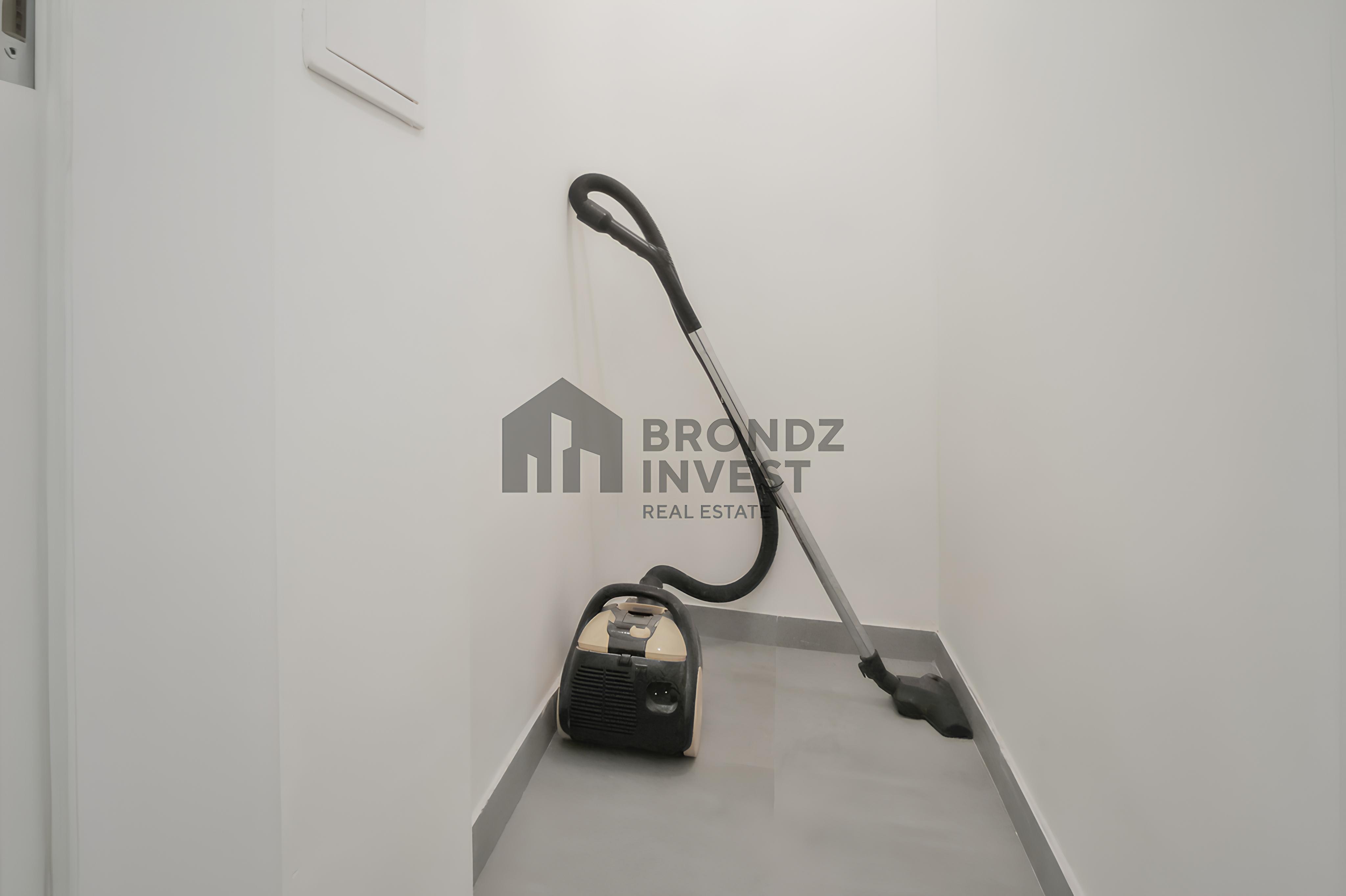 The apartment consists of a spacious bedroom, kitchen, bathroom with a bathtub and toilet, and a separate storage room.