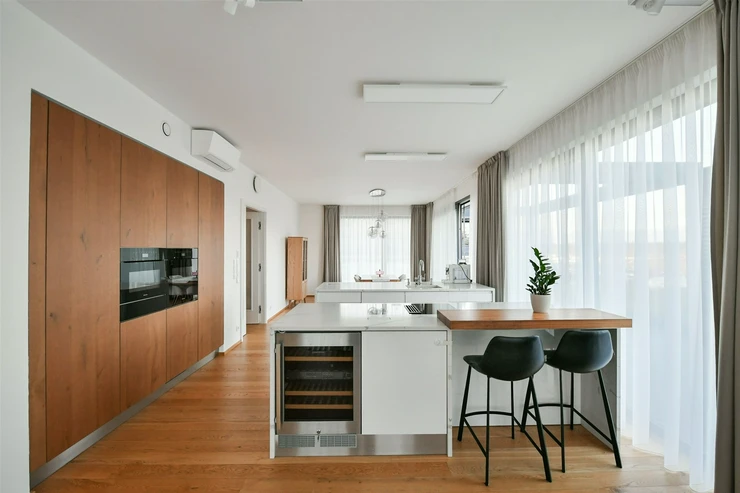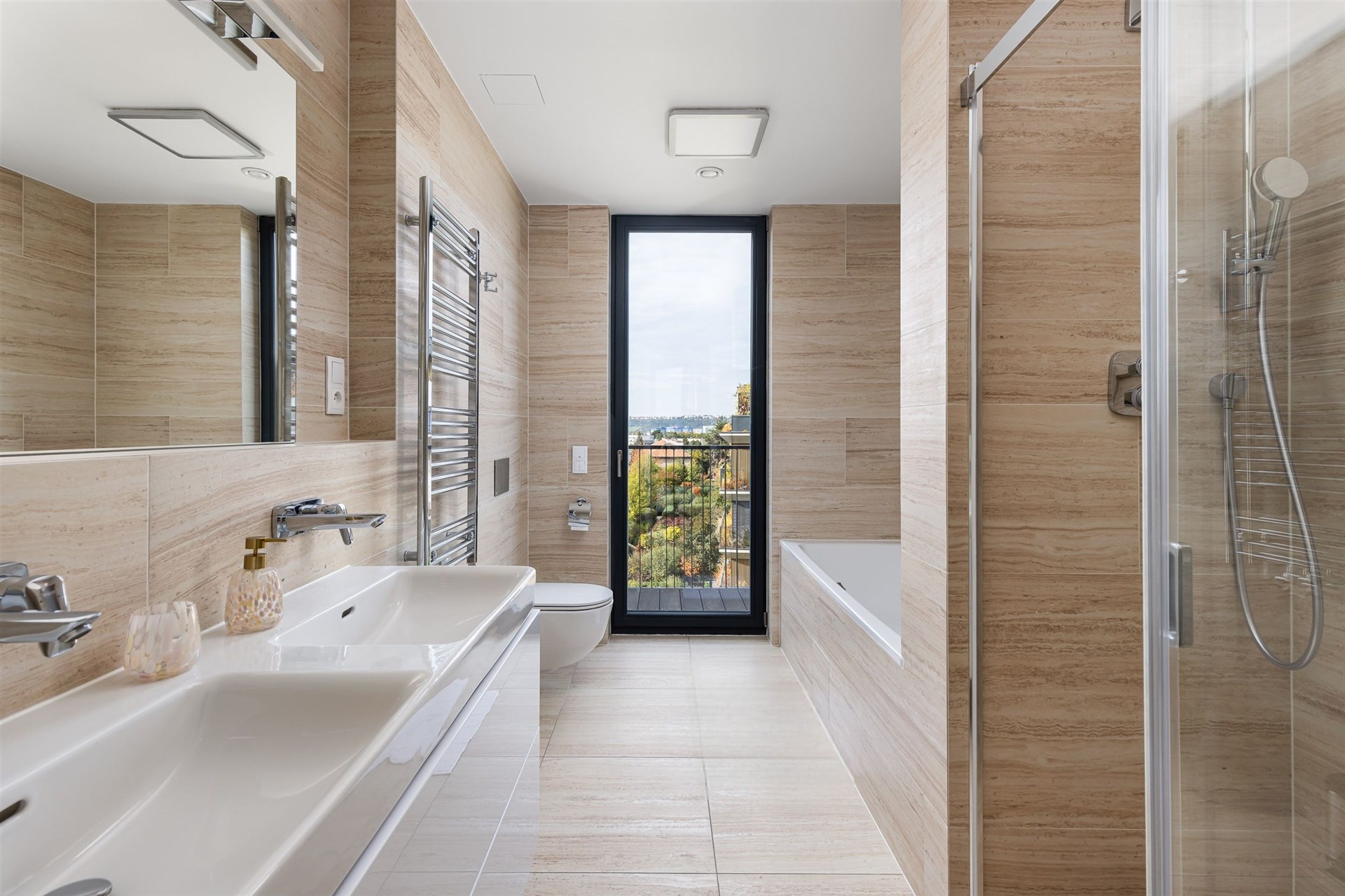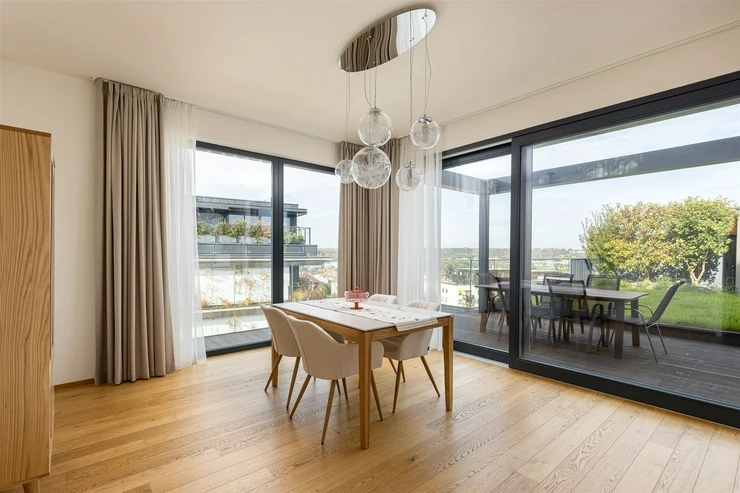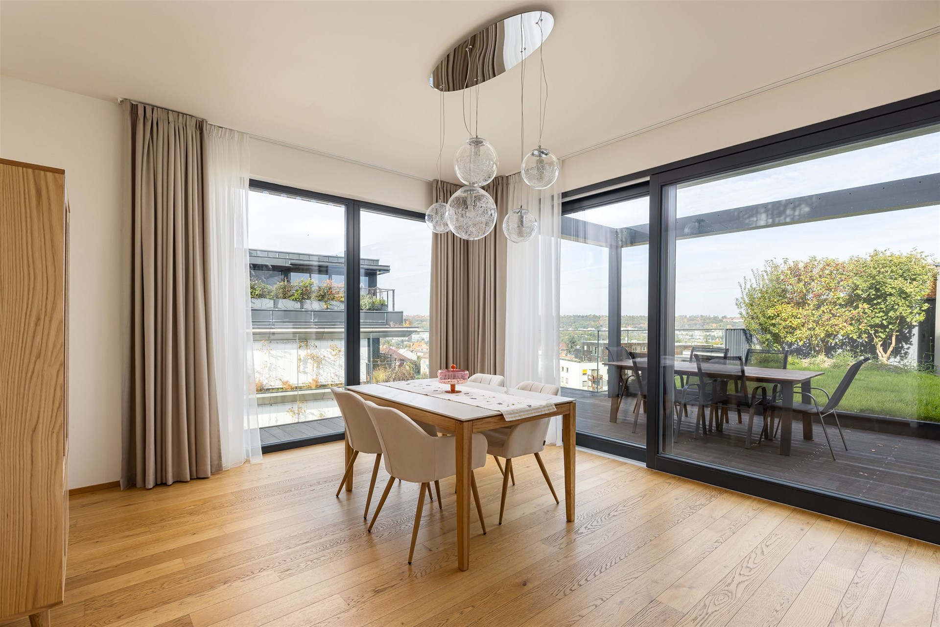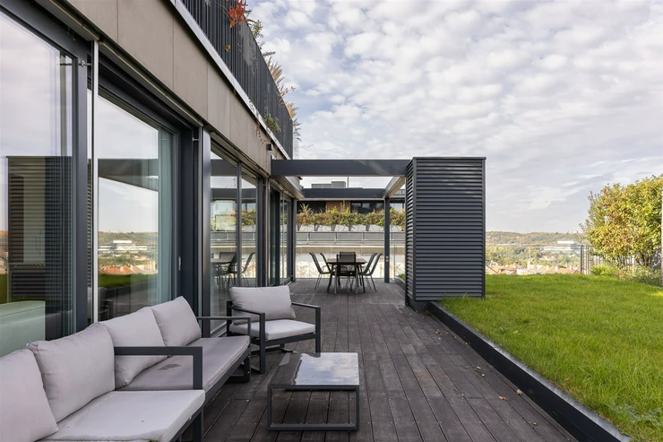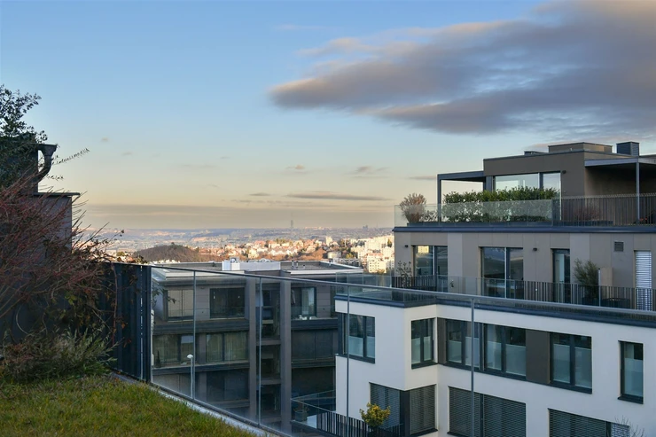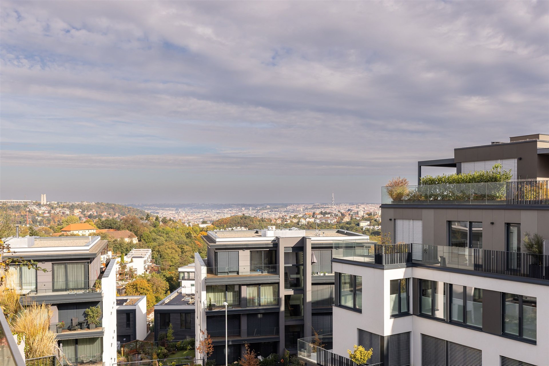 Become a tenant of the extraordinary and exceptional Košíře "Penthouse"! This carefree living project is nestled in the peaceful, healthy environment of the Košíře villas, just a few minutes' walk from the Vidoule nature reserve, the Deutsche Schule Prag, etc. The location not only offers long moments for absolute relaxation, but also very quick connections to any part of Prague, including the airport.