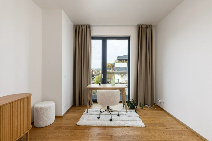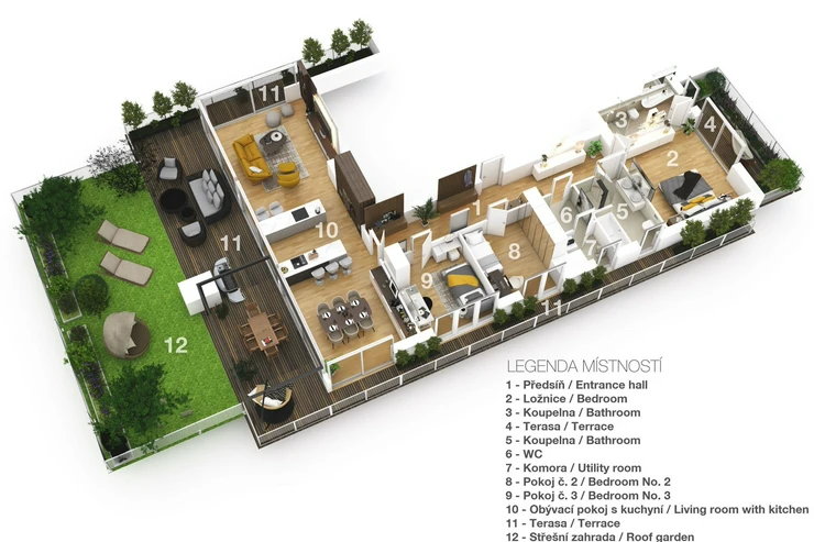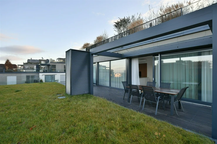 The central room here is a spacious living room with a dining area and a fully equipped kitchen, also with access to the expansive terrace and the rooftop garden offering amazing views of the surroundings. The cozy bedroom with an en-suite bathroom has another access to a separate terrace. The windows of the second and third bedrooms face across the terrace into a very quiet zone of the residential park. In the entrance hall are large wardrobes; in the pantry are a washer and dryer, other equipment as shown in the pictures; another advantage of the apartment is a separate guest bathroom with toilet.