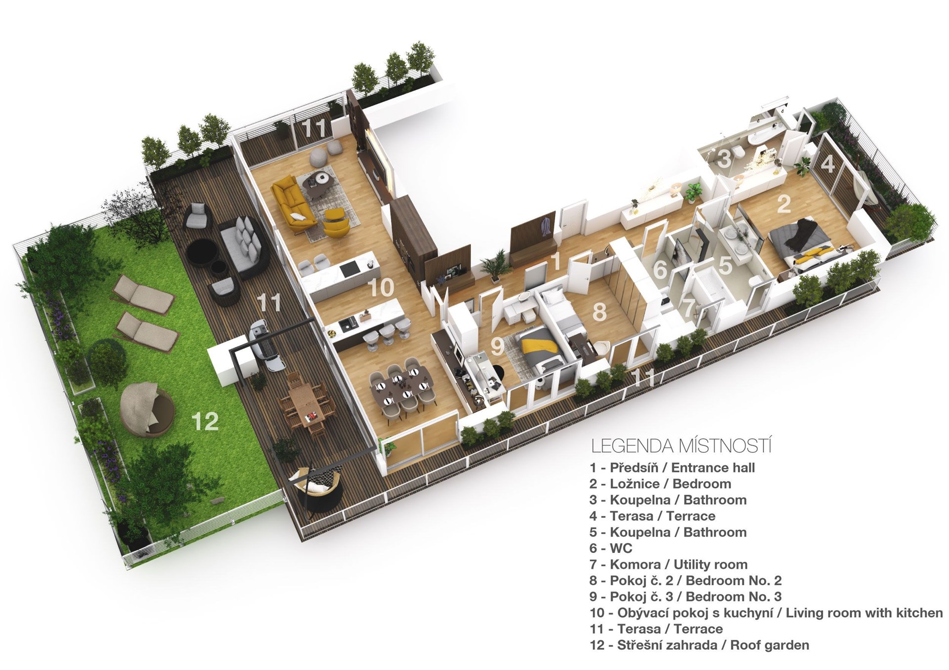Entering the apartment, a spacious hall serves as a gateway to all separate rooms with terrace access along the entire apartment: a living room with a kitchen and access to the terrace and rooftop garden, the master bedroom with its own bathroom, the second bedroom, the third bedroom, a bathroom with a toilet, bathtub and shower, an extra guest bathroom with toilet, and a pantry.