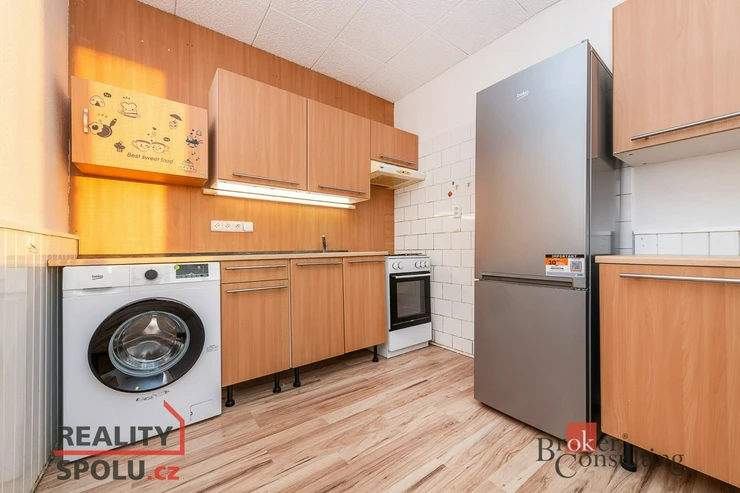 Byt je částečně zařízený, k dispozici je jídelní stůl, kuchyňská linka včetně spotřebičů - sporák, odsavač par, lednice, pračka. Skříně v ložnicích a předsíni.