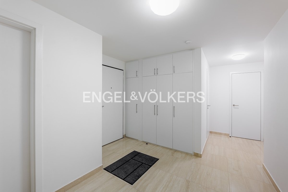 The dominant feature of the apartment is a spacious living room connected to the kitchen. The layout also includes three separate bedrooms, two bathrooms, and a separate utility room with a washing machine and dryer. The interior was custom-designed by the owner with an emphasis on high standards. Quality wooden floors are laid throughout the apartment, with elegant tiling in the bathrooms. Living comfort is further enhanced by air conditioning in the living room.