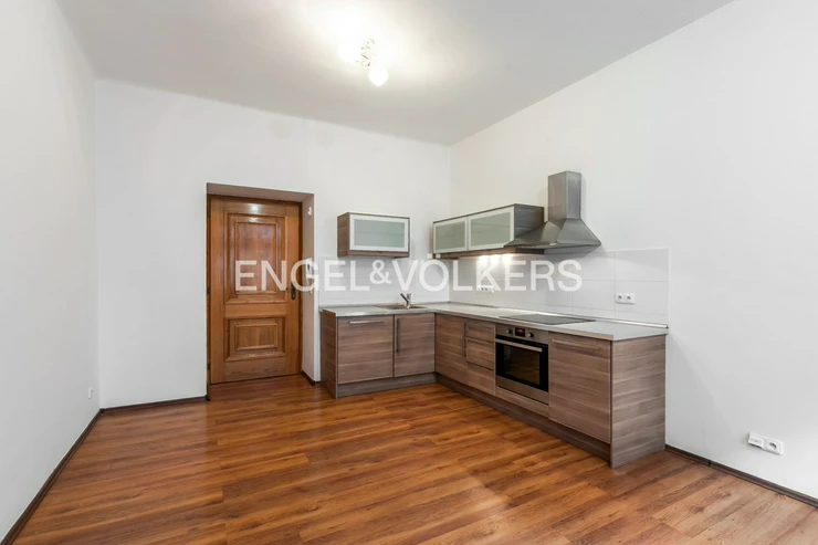 The layout consists of a living room with a kitchenette, a separate bedroom, and a bathroom with a bathtub. The kitchen is equipped with a dishwasher, oven, and a four-burner hob. The apartment is unfurnished, has laminate flooring, and thanks to soundproof windows, it offers pleasant living even with windows facing the street.