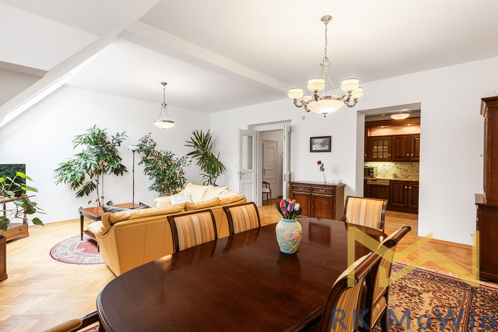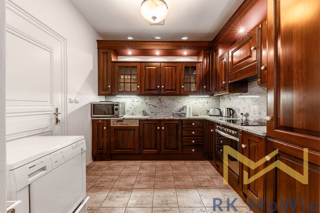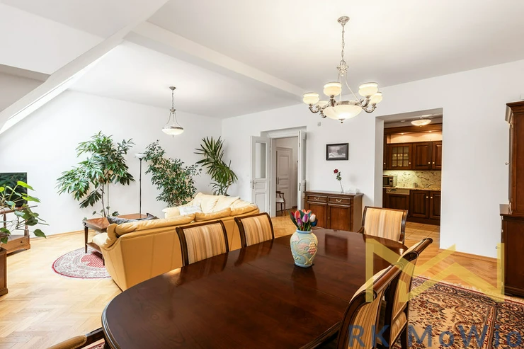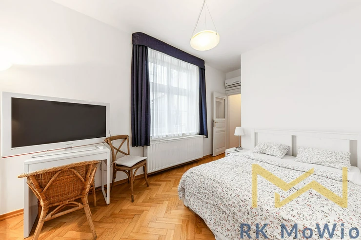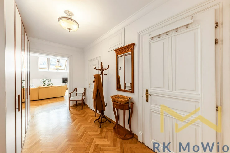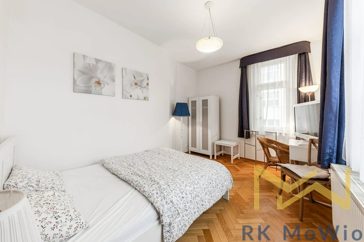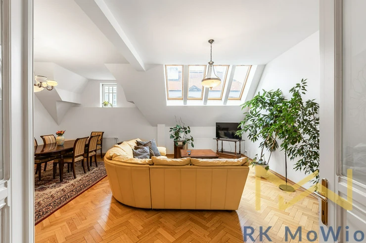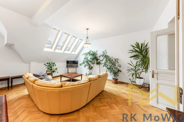 We are offering a designer-furnished 2-bedroom apartment for rent, with a usable area of 110 sqm, featuring a balcony. It is located on the 4th floor (5th above-ground floor) of an Art Nouveau building with an elevator on Maiselova Street, in the Josefov district of Praha 1.