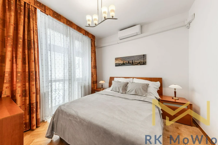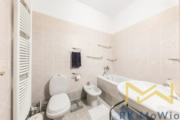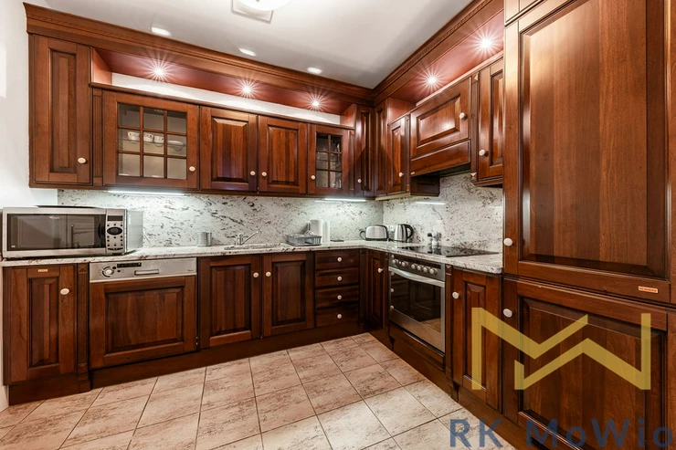 The layout of the unit includes an entrance hall, a spacious living room, a dining room, a separate kitchen, bedroom with an en-suite bathroom (with a bathtub, sink and toilet), a second bedroom, another bathroom (equipped with a shower, sink and toilet) and a balcony. Additional apartment features include a fully equipped kitchen with a fridge-freezer, ceramic hob, extractor hood, electric and microwave oven and dishwasher; built-in wardrobes, washing machine, dryer, high-speed internet readiness, wooden, parquet floors and tiles.
