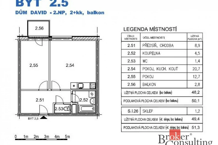 Byt se nachází ve 2. patře a součástí bydlení je i vnitřní parkovacího stání. Dispozice bytu je kuchyň s kuchyňskou linkou, ložnice, balkónek, koupelna s WC. Byt je k nastěhování od 1.2.2026