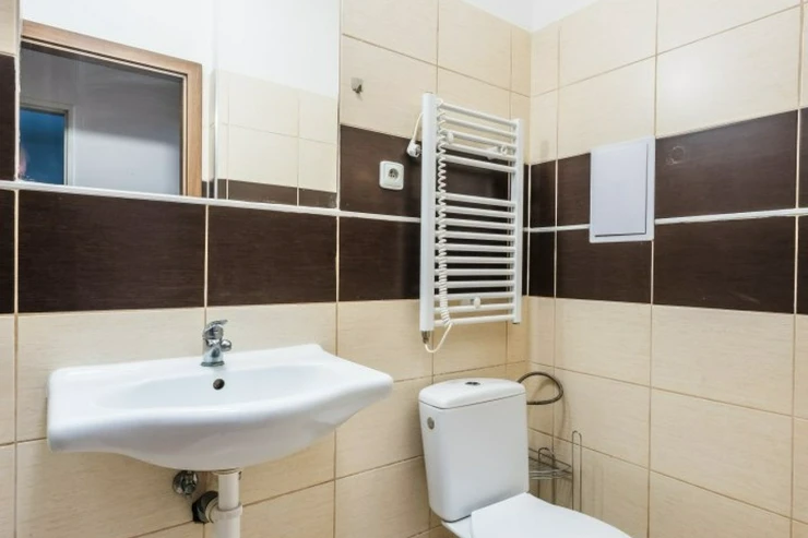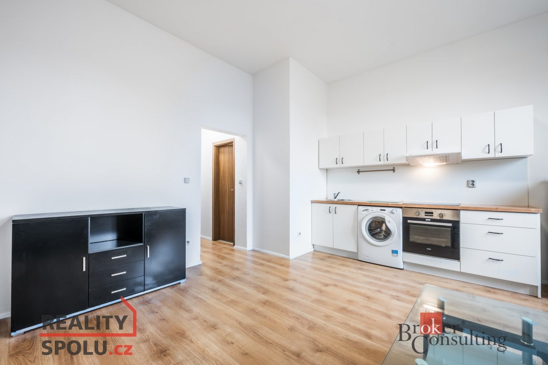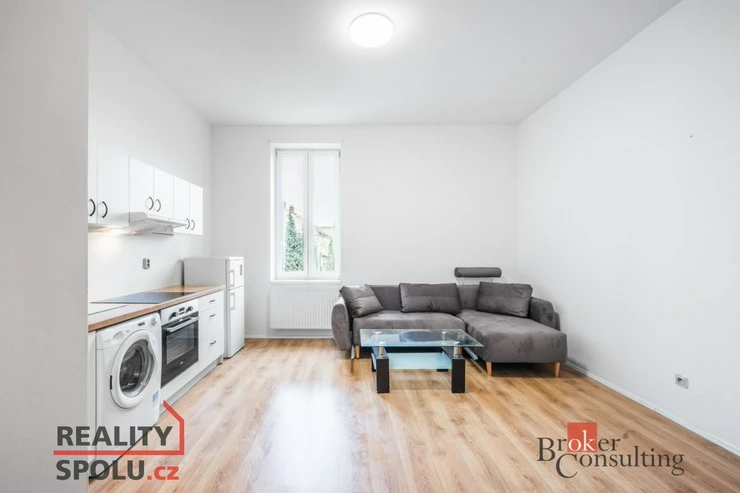 Byt je po úpravách, čistý a slunný, ideální pro jednotlivce či pár. Dispozice zahrnuje obývací pokoj s kuchyňským koutem, koupelnu se sprchovým koutem a WC. Byt se pronajímá bez vybavení. Nábytek a doplňky, které jsou viditelné na fotografiích, nejsou součástí pronájmu.