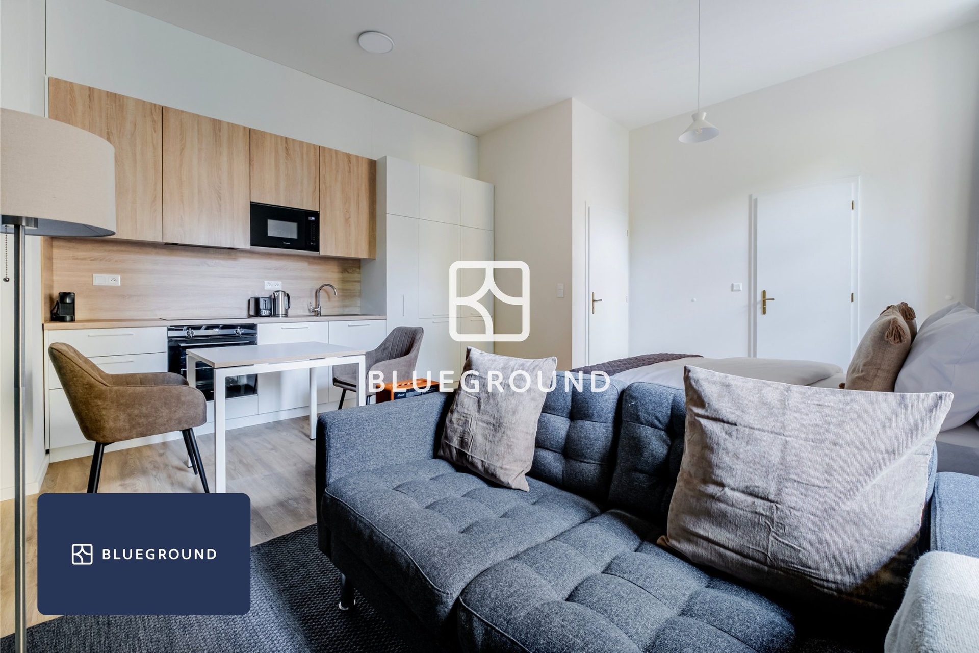 Blueground offers a fully furnished studio apartment in the sought-after Holešovice district, available for stays of one month or longer. Located in Prague 7, this well-connected and evolving neighborhood combines residential calm with vibrant city life. The apartment is ideally situated near parks, cafés, and cultural spaces, offering quick access to the city center while maintaining a peaceful local vibe. With its modern amenities and spacious layout, this home is a great choice for professionals, couples, or small families looking for comfort, style, and convenience in one of Prague’s trendiest districts.