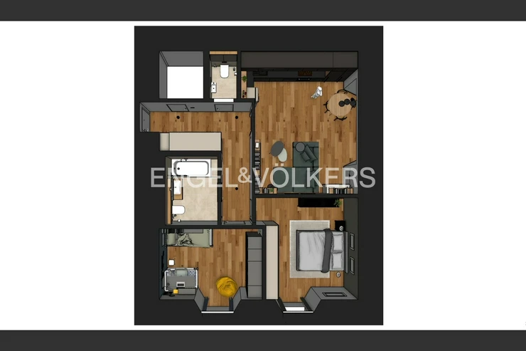 The apartment has an entrance hall with a built-in wardrobe, a living room connected to a fully equipped kitchen and access to a balcony (2.6 m²), a master bedroom, and a room that can be used as a study, children's room, or guest room—this is the only room that remains unfurnished. There is also a bathroom with a bathtub, a separate toilet, and a storage room.