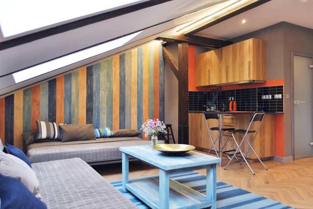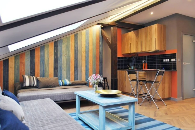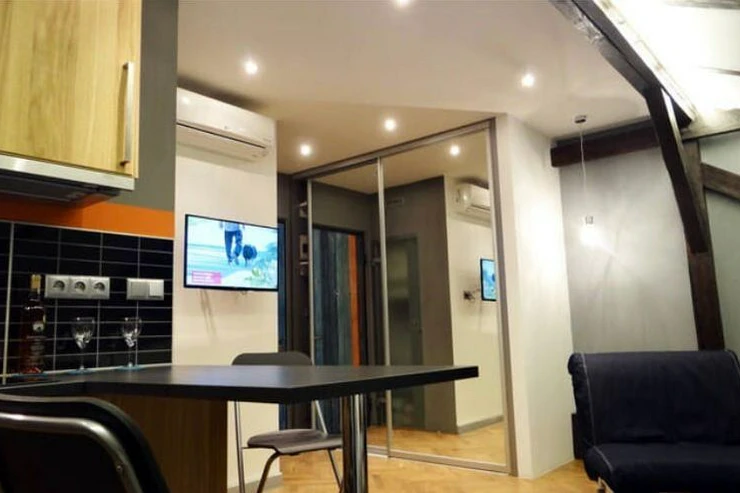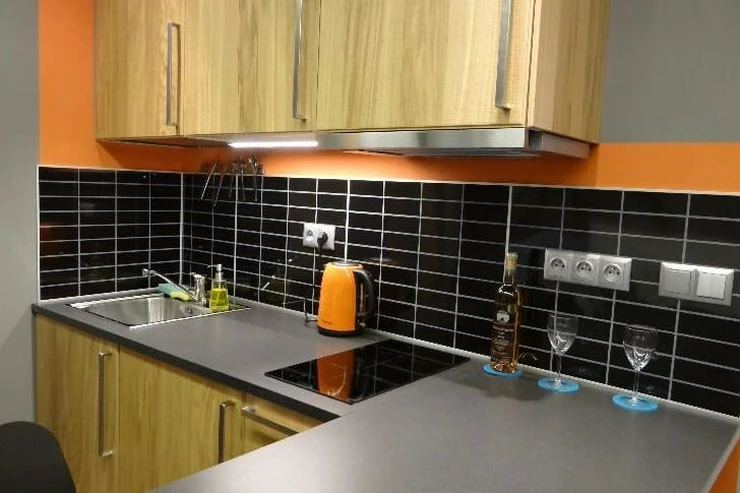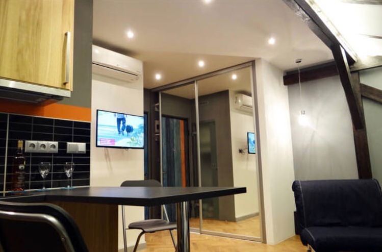The apartment is fully furnished and equipped with household appliances: washing machine, kitchen unit with all necessary cooking equipment, electric kettle, double bed, fold-out sofa, and 2 folding chairs.