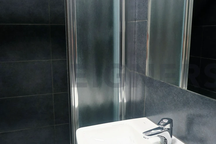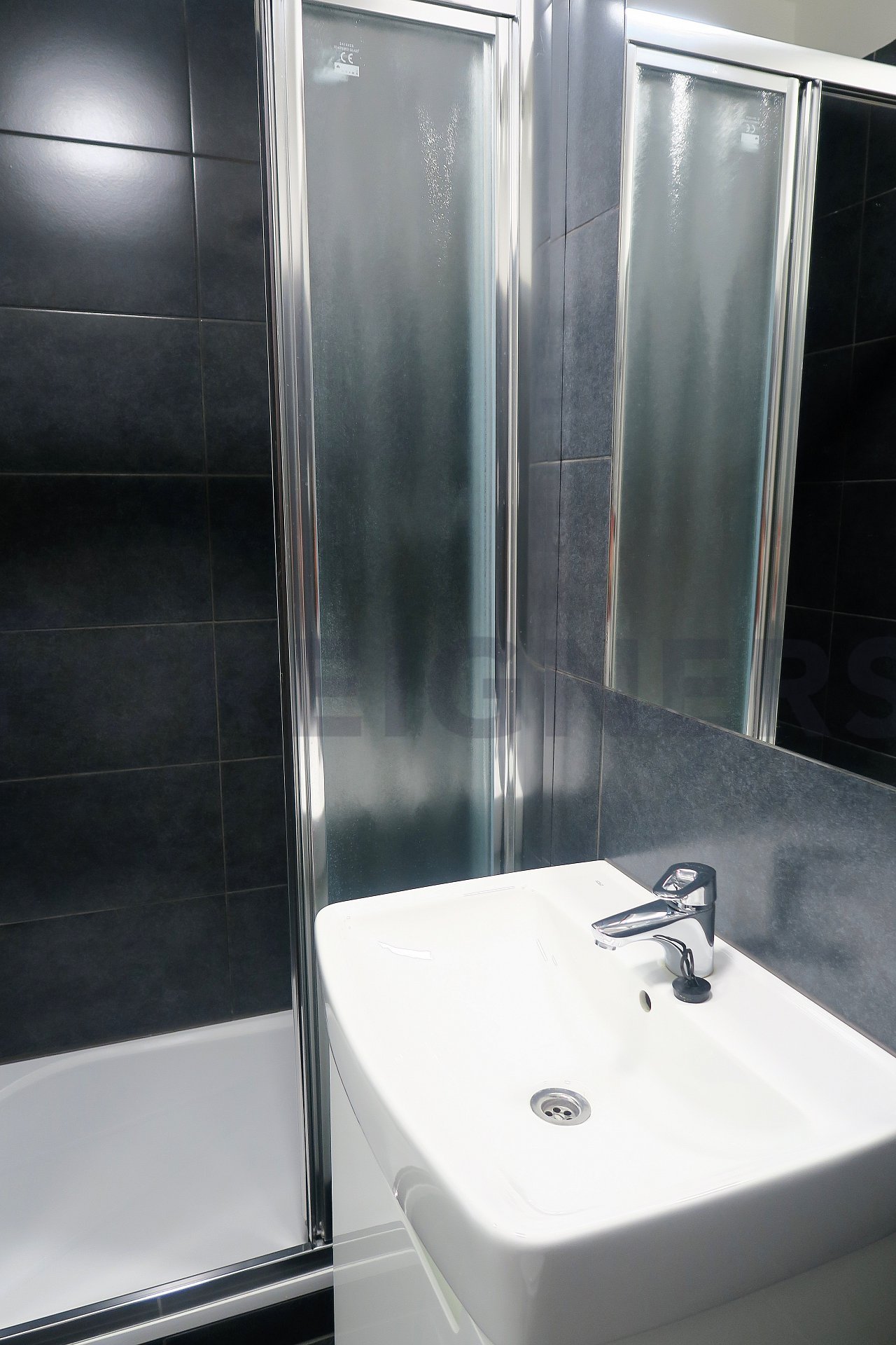 The bathroom features a shower, a washbasin with a vanity cabinet, and is combined with the toilet.
