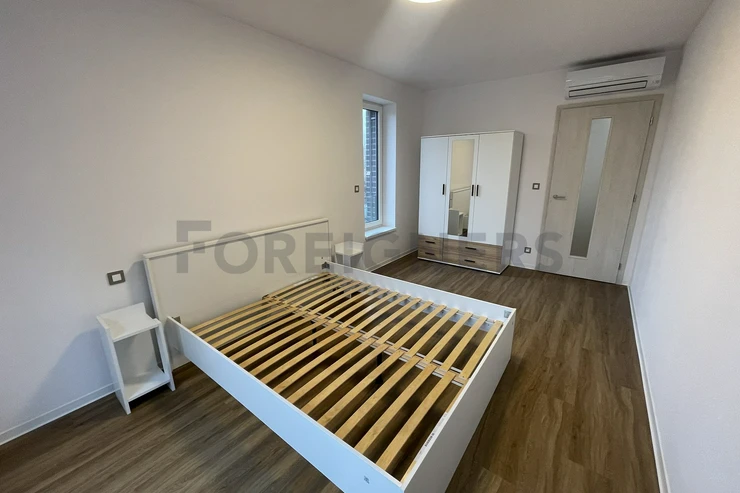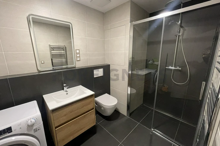 All equipments are modern and brand new. Kitchen corrner is equipped with fridge and freezer, dishwasher, induction stove with electric oven and dining table with 4 chairs. Living room area consists of sofa, coffee table and tv stand. One bedroom is furnished with the wardrobe and double bed with night stands. The second bedroom can be used as office and stay empty or as second bedroom with double bed. In the bathroom we can find a spacious shower corrner, heating racks, sink with cabinet and mirror and as well the wasching machine with a dryer. In the corridor there is coat hanger and shoe racks.