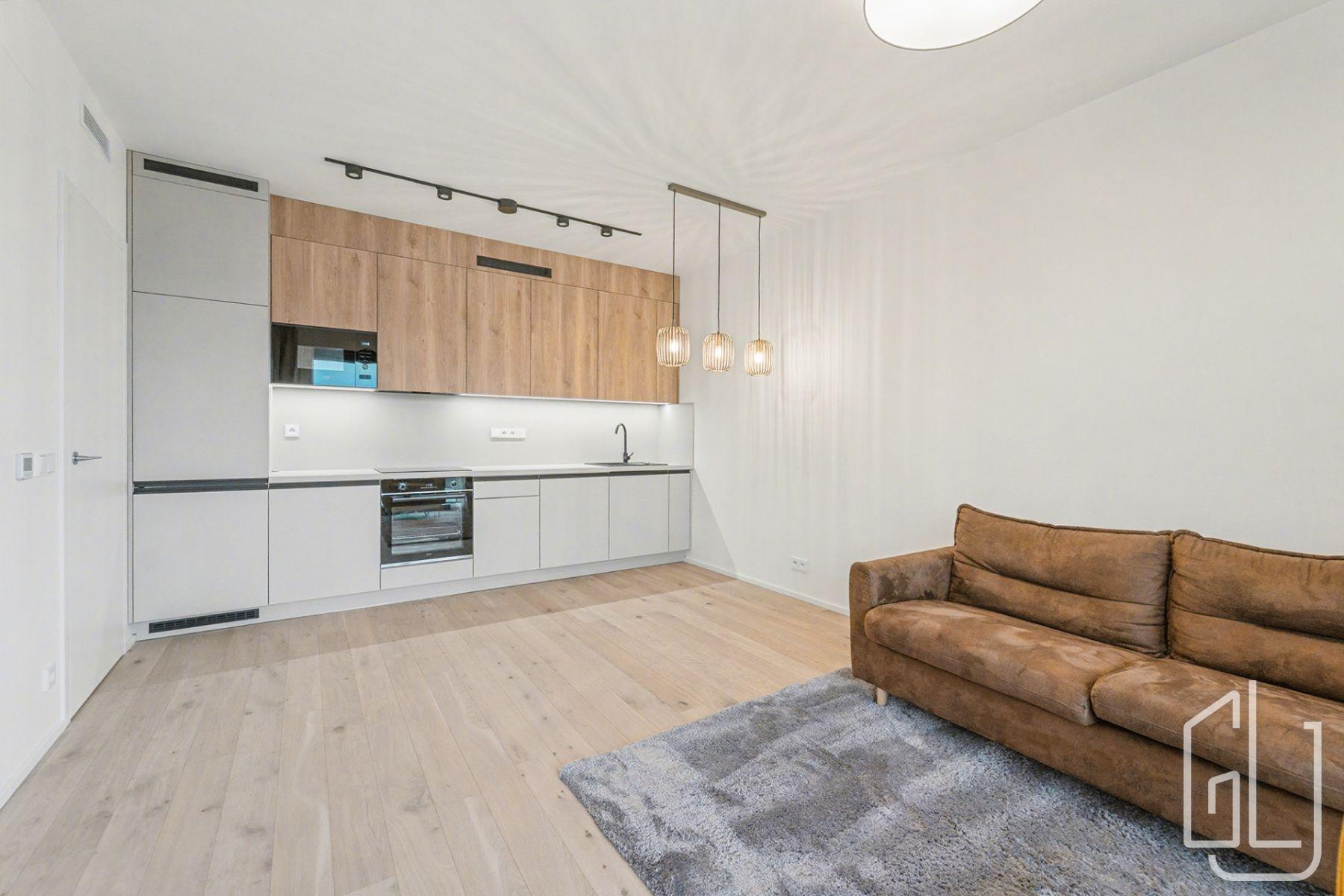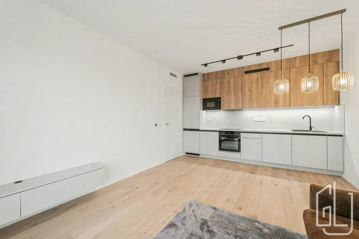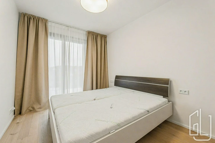 Byt je připravený pro prvního nájemce a nabízí prakticky řešený interiér s dostatkem úložných prostor. Vstupní předsíň o velikosti 8,5 m je vybavena vestavěným botníkem. Obývací pokoj o rozloze 21 m je propojen s moderní kuchyňskou linkou, která je plně vybavena spotřebiči, a navazuje na prostornou terasu o velikosti 16 m. Součástí obytné části je sedací souprava, křeslo a nástěnný TV stolek.