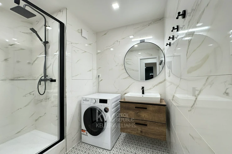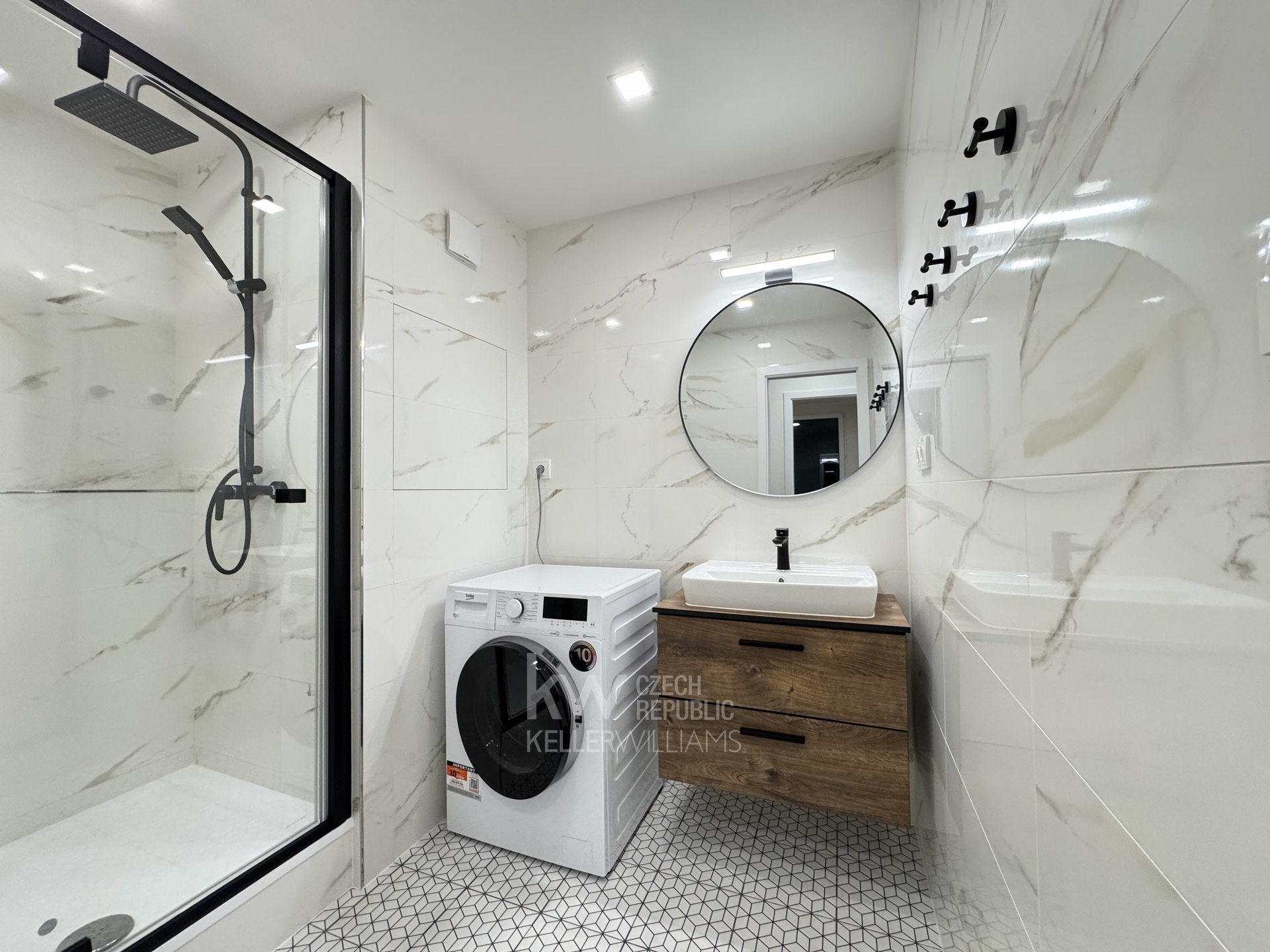nová koupelna, sanitární zařízení a moderní povrchy s novou pračkou Beko