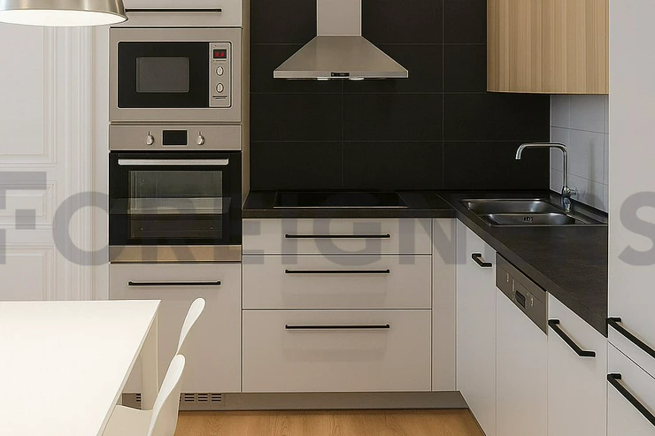 The apartment has three rooms, a bathroom with a shower, a separate toilet, and a modern open-plan kitchen connected to the living area. The kitchen is fully equipped with an oven, microwave, dishwasher, fridge, freezer, and stovetop.