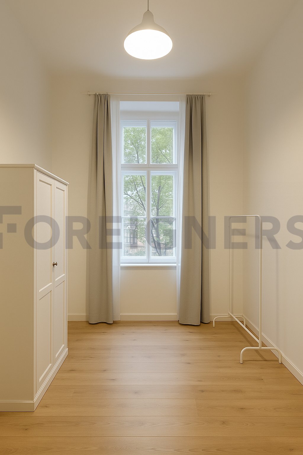It comes fully furnished with a 140 cm bed, wardrobe, desk, and chair.