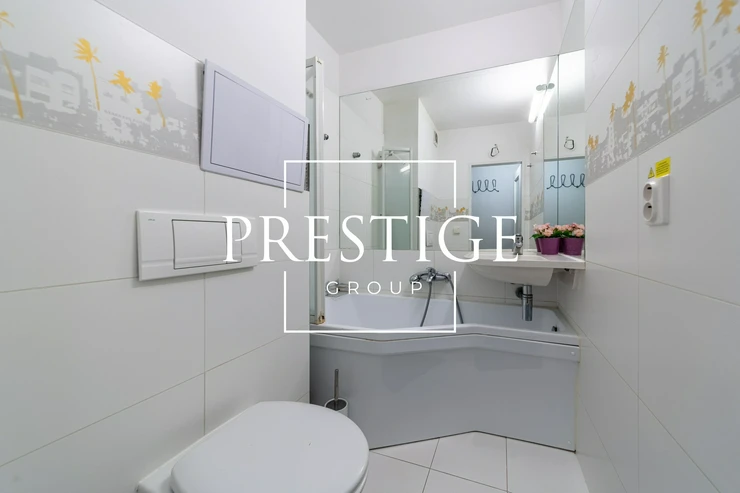 The apartment is partially furnished. There is a sofa and a wardrobe in the living room. The kitchen is equipped with all appliances (fridge, dishwasher, microwave oven, induction hob), the room has a storage cupboard and a chest of drawers. The bathroom is equipped with a bathtub, sink and toilet.