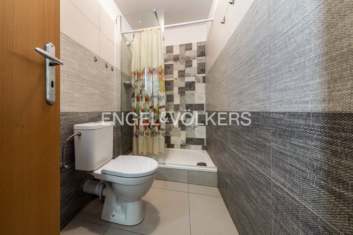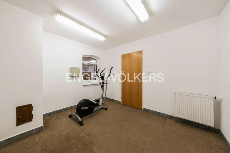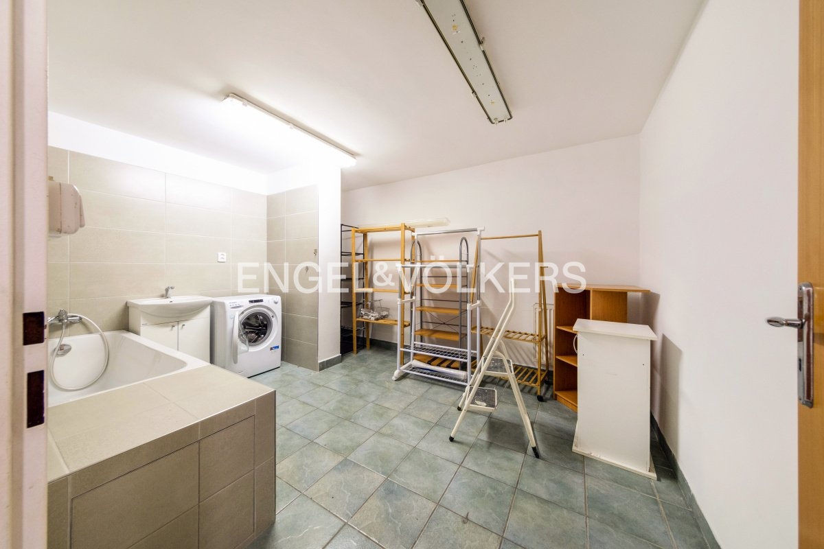 Upon entering the building, stairs lead to a hallway, where there is a bathroom with a toilet and shower on the left-hand side, then there is a laundry room with a washing machine and bath, followed by a room that was used as a gym, and opposite is a cloakroom. On the right side is the main room of 50,5 m², which is equipped with a kitchen and a wood-burning stove.