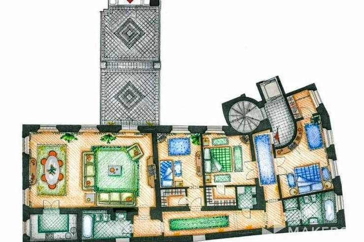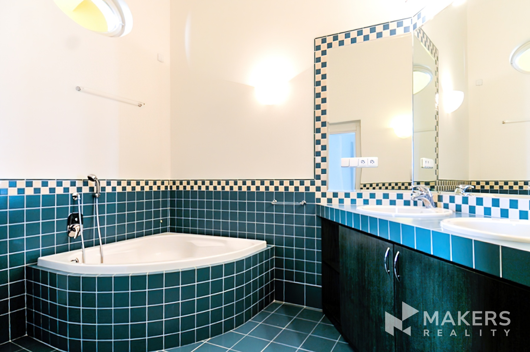 The apartment with a total area of 178 m2 has its own entrance from the courtyard of the building. Entering the apartment through the entrance hall, we can get to the first bedroom with a separate bathroom with bathtub. Further on the left side of the apartment there is a living room with dining room, through which we have access to the kitchen, bathroom with shower and storage room. A great feature of this apartment is the 35 m2 terrace (private garden).