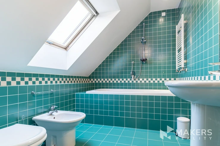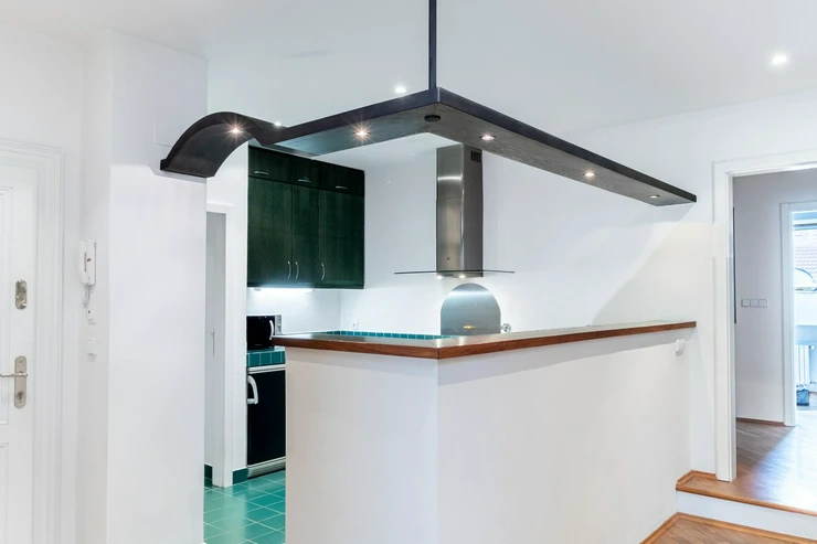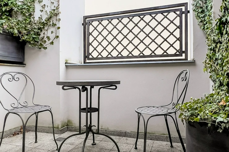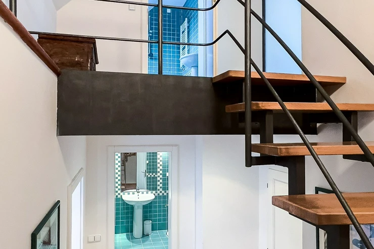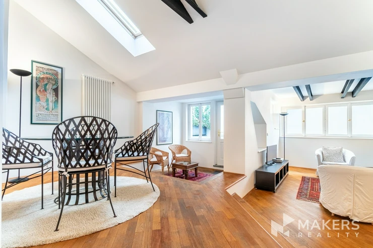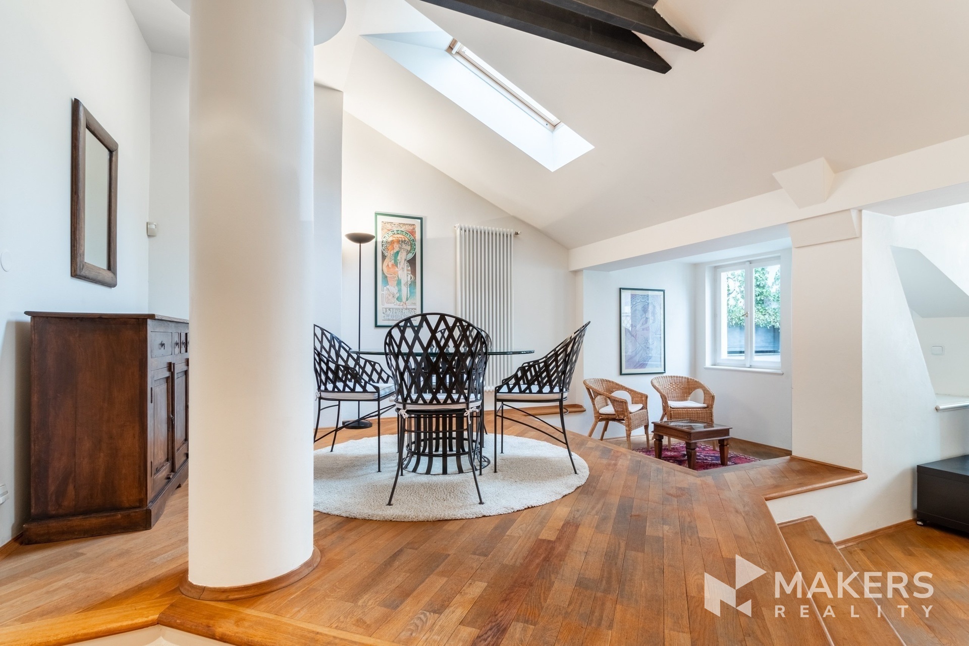 We offer a unique two-story attic apartment with an area of 96 m² located on the 5th and 6th floors of a brick building. The apartment provides a magical view of Prague's rooftops and features a small balcony with ivy near the living room. It is fully furnished with luxury furniture and suitable for 4 adults.