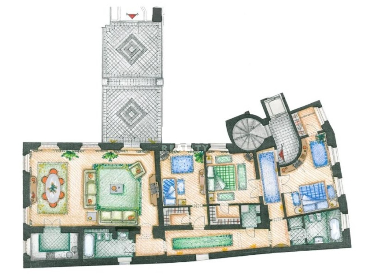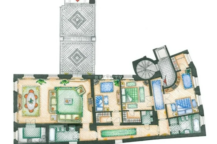 Jedinečný byt s terasou v blízkosti Malostranského náměstí. Nabízíme k pronájmu jedinečný byt o podlahové ploše 178 m2, který se nachází ve 2. patře krásného historického domu v ulici Vlašská na Malé Straně. Velkou výhodou je nádherná a jižně orientovaná terasa o velikosti 35 m2, která patří k bytu. Ideální na odpočinek nebo posezení s přáteli. Byt se skládá z prostorného obývacího pokoje s jídelní částí, plně vybavené kuchyně, tří ložnic, dvou koupelen, dvou komor a šaten. Byt má dva samostatné vstupy, z nichž jeden je přímo z výtahu. Všechny tři ložnice jsou vybaveny vestavěnými skříněmi. K dispozici jsou dvě koupelny, z nichž jedna je vybavena vanou a druhá sprchovým koutem. Terasa je přístupná z obytných místností a je orientována na jih. Byt se pronajímá částečně zařízený. K dispozici je příprava na satelitní televizní příjem. Byt se nachází v oblíbené lokalitě v centru Prahy. V okolí je kompletní občanská vybavenost. Restaurace, obchody, pošta, zdravotnická zařízení, školy a knihovny. Lokalita nabízí možnosti pro volnočasové aktivity a procházky, například Petřínské sady s vyhledávanou rozhlednou, Pražský hrad s krásným parkem, Kampu či Náplavku. V okolí je možné navštívit řadu památek či kulturních akcí. Výborná dopravní dostupnost. Tramvajová zastávka Malostranské náměstí (tram 12, 20, 22) vzdálena pár minut chůze. Nejbližší stanice metra A (Malostranská) vzdálena jednu zastávku tramvají či 10 min pěsky. Krásné bydlení ve skvělé lokalitě. Doporučujeme.