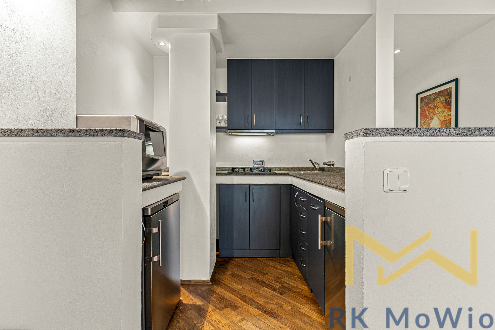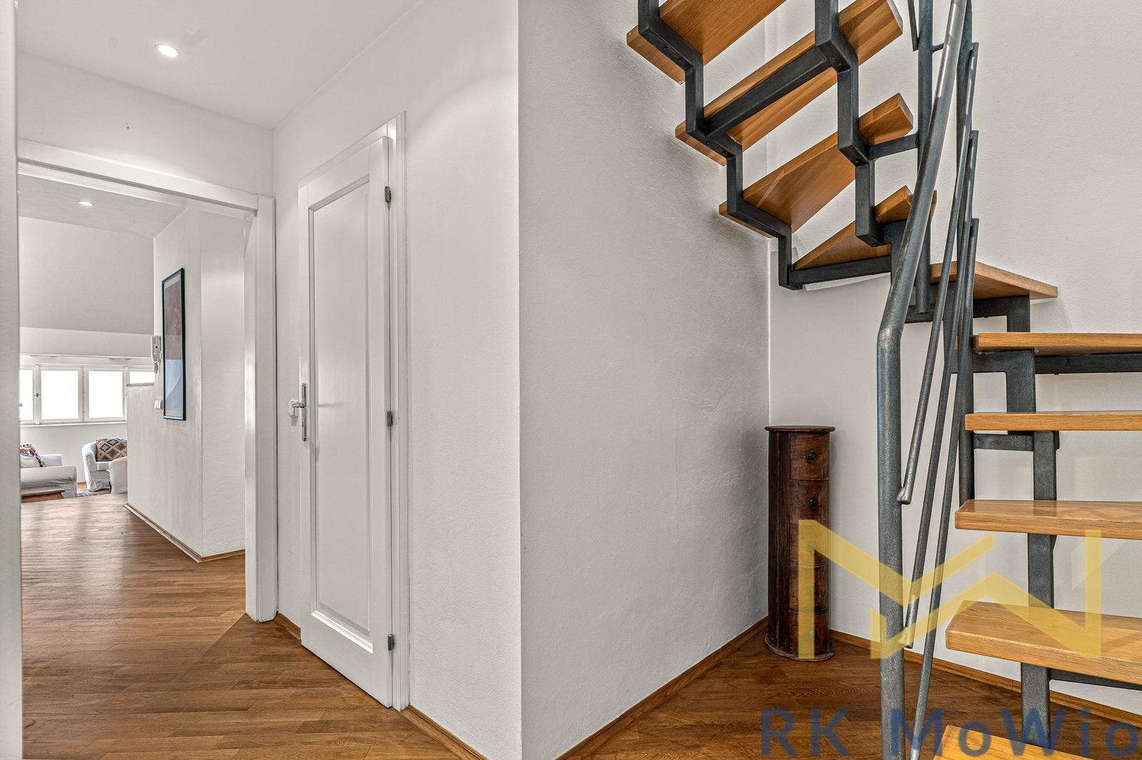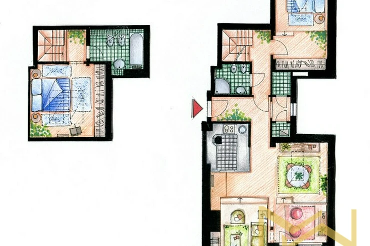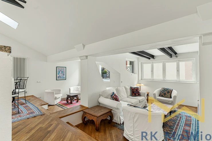 The lower level of the apartment features an entrance hall, an airy living room with skylights and original details, a dining area with access to the balcony, a kitchenette, one bedroom with a walk-through closet, a bathroom (with a shower, sink, bidet and toilet) and two storage rooms. The upper level includes the master bedroom and an additional bathroom (with a bathtub, sink, bidet and toilet). Apartment amenities include a fully equipped kitchen with a refrigerator/freezer, gas cooktop, hood, dishwasher, electric and microwave oven; built-in wardrobes, connections for a washer and dryer, high-speed internet readiness, wooden floors and tiles. Photos are for illustrative purposes only.