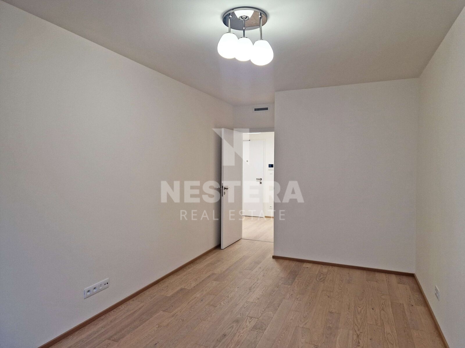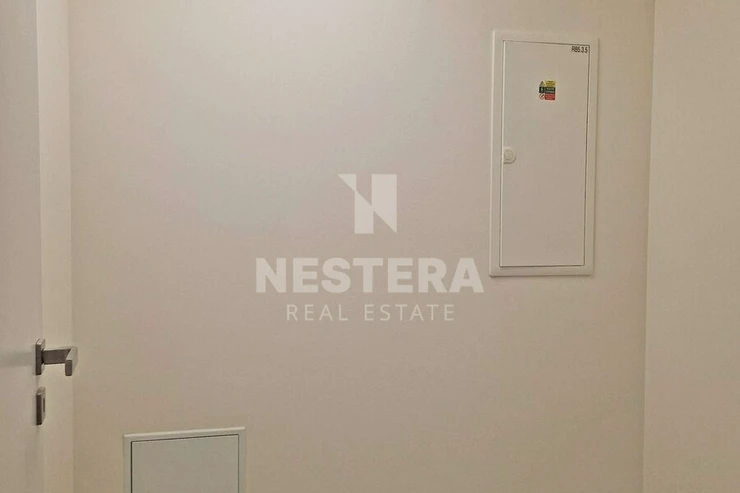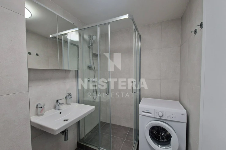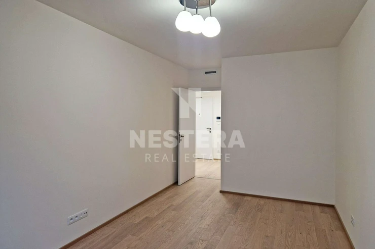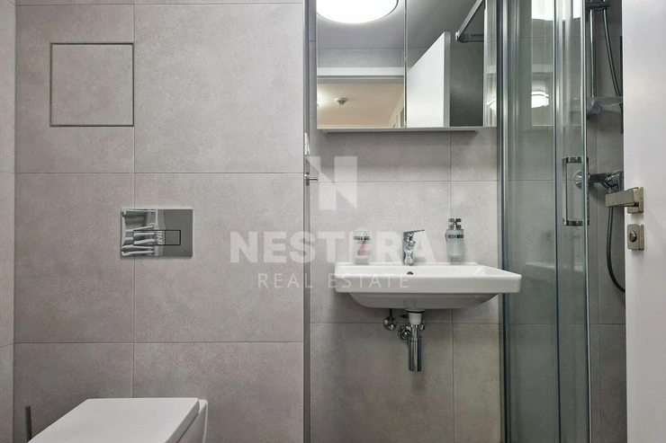 The apartment is equipped to a high standard. It features wooden floors, ceramic tiles, triple-glazed windows, and a heat recovery system. It is divided into a simple hallway from which all rooms are accessible. There is a living room with a kitchenette, a bedroom, a bathroom with a toilet, and a storage room. The apartment faces east towards the pedestrian zone of Albrightová Street.