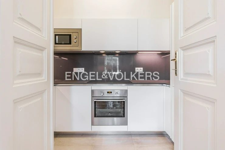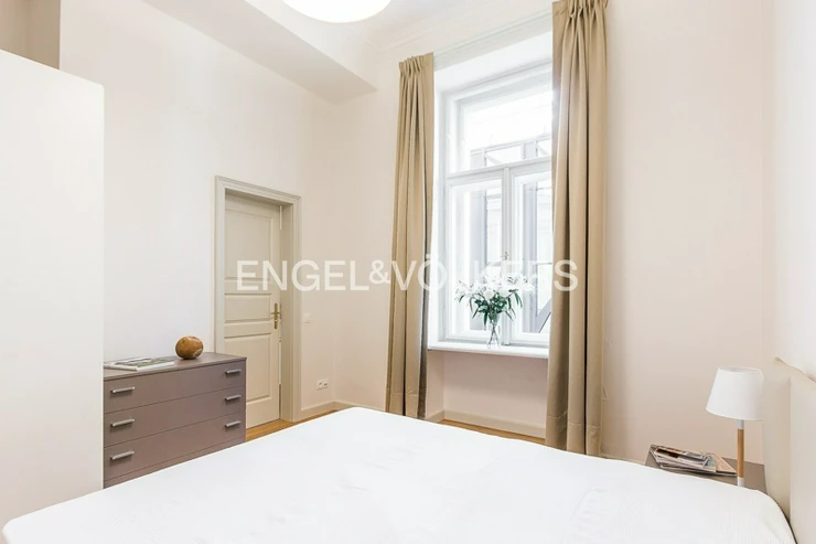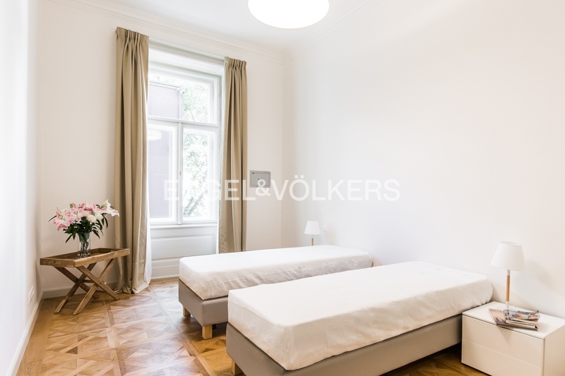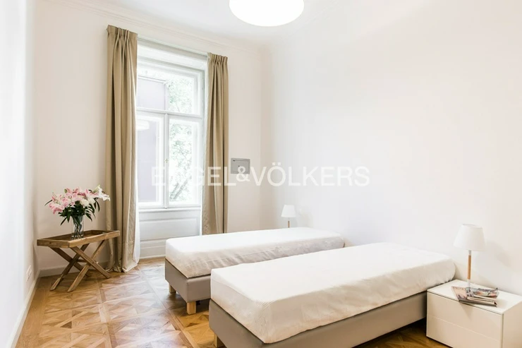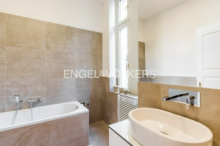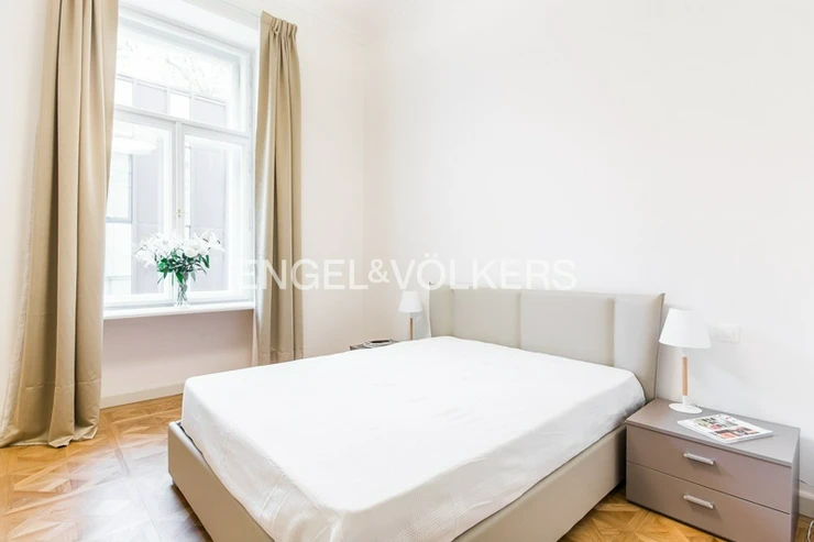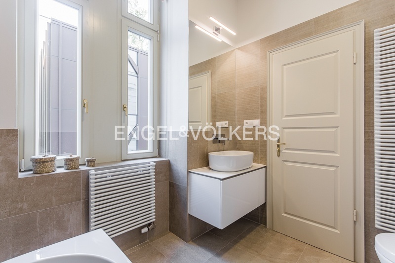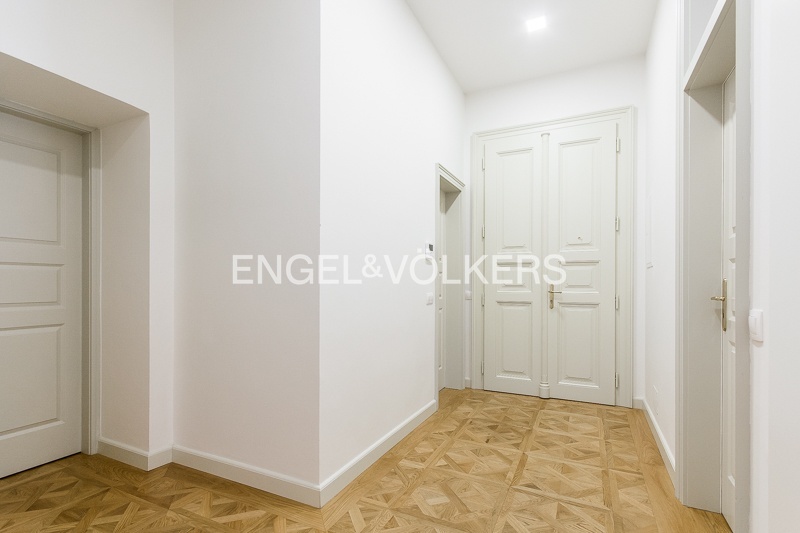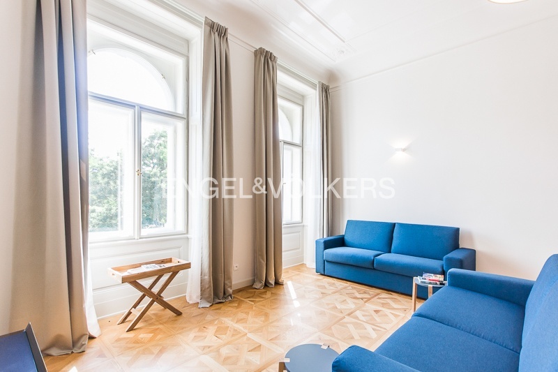 The apartment is located on the 1st floor of a historic building that has undergone a complete renovation to the highest standard. Preserved stucco ceilings, wood panelling, metalwork, and other specific features of this building combine to create a unique work of art. Only high-quality materials were used for the renovation.