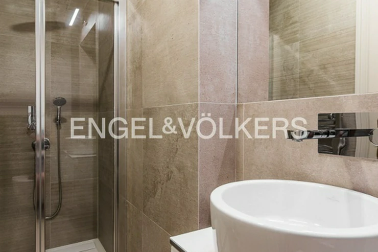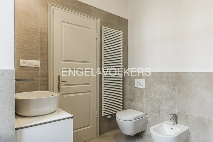 The spacious and bright living room with a dining table is the heart of this wonderful apartment. The separate, custom-made Italian kitchen with all appliances offers all the comforts of modern cooking. The master bedroom, facing a quiet courtyard, is connected to its own bathroom and offers plenty of storage space. The modern family bathroom has a bathtub, sink, toilet, and bidet.