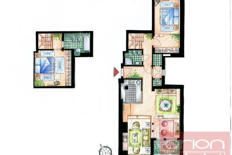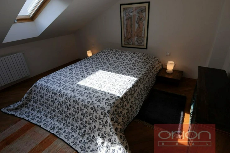 We offer for rent a duplex two bedroom apartment with a balcony on the 5th and 6th floor of a renovated apartment building with an elevator in the sought-after location of Prague 2. The fully furnished apartment with an area of 96 sqm offers on the lower floor an equipped kitchen open to a spacious living room with a dining room and access to a balcony facing south, 1 bedroom with a built-in wardrobe, 1 bathroom with a shower and toilet, 2 storage rooms. On the upper floor there is 1 bedroom with a built-in wardrobe and a bathroom with a bathtub and toilet. The apartment is furnished in a luxurious style with oriental carpets and stylish furniture. The apartment is equipped with wooden parquet and tiles, videophone, gas heating. Pets are welcome. Excellent location, the apartment is located just a few steps from Karlovo náměstí Square, where there is a tram stop and a metro station, near the Vltava embankment, about a 10-minute walk to Wenceslas Square. All civic amenities, restaurants, cafes, shops are nearby.