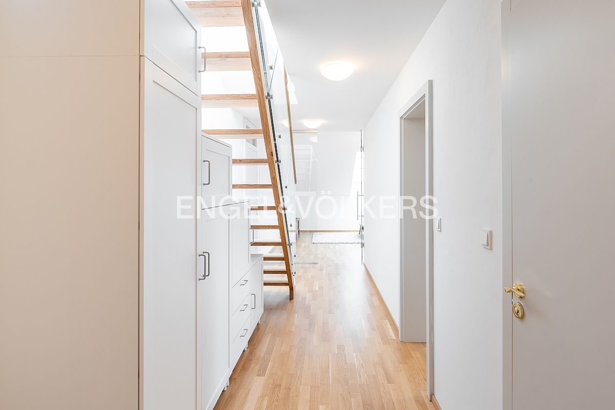 A beautifully designed duplex apartment is available for rent in a historic apartment building that has undergone a complete renovation, preserving all architectural and decorative elements.