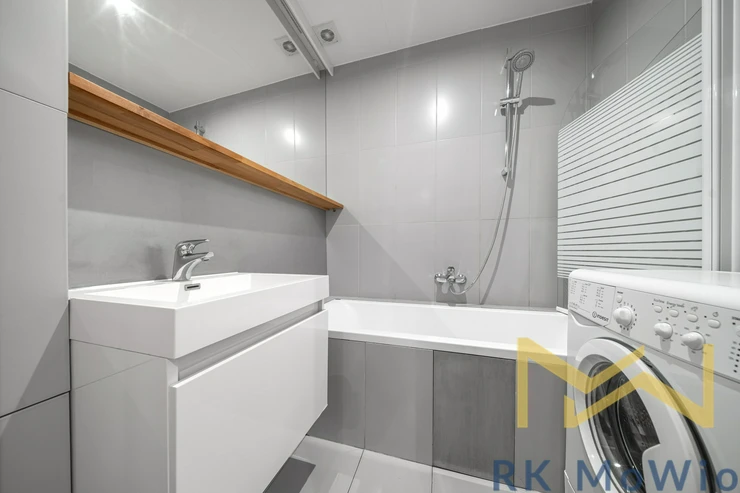 The layout of the apartment comprises an entrance hallway, a bright living room, a kitchen, a master bedroom with access to a balcony (10 sqm) running along the entire room, a second bedroom with access to a second balcony, one bathroom (with a bathtub and washbasin), and a separate toilet. Apartment equipment includes a fitted kitchen (with fridge/freezer, ceramic hob, extractor hood, dishwasher, and electric oven), wardrobes, a washing machine, preparation for high-speed internet, wooden floors, and tiles.