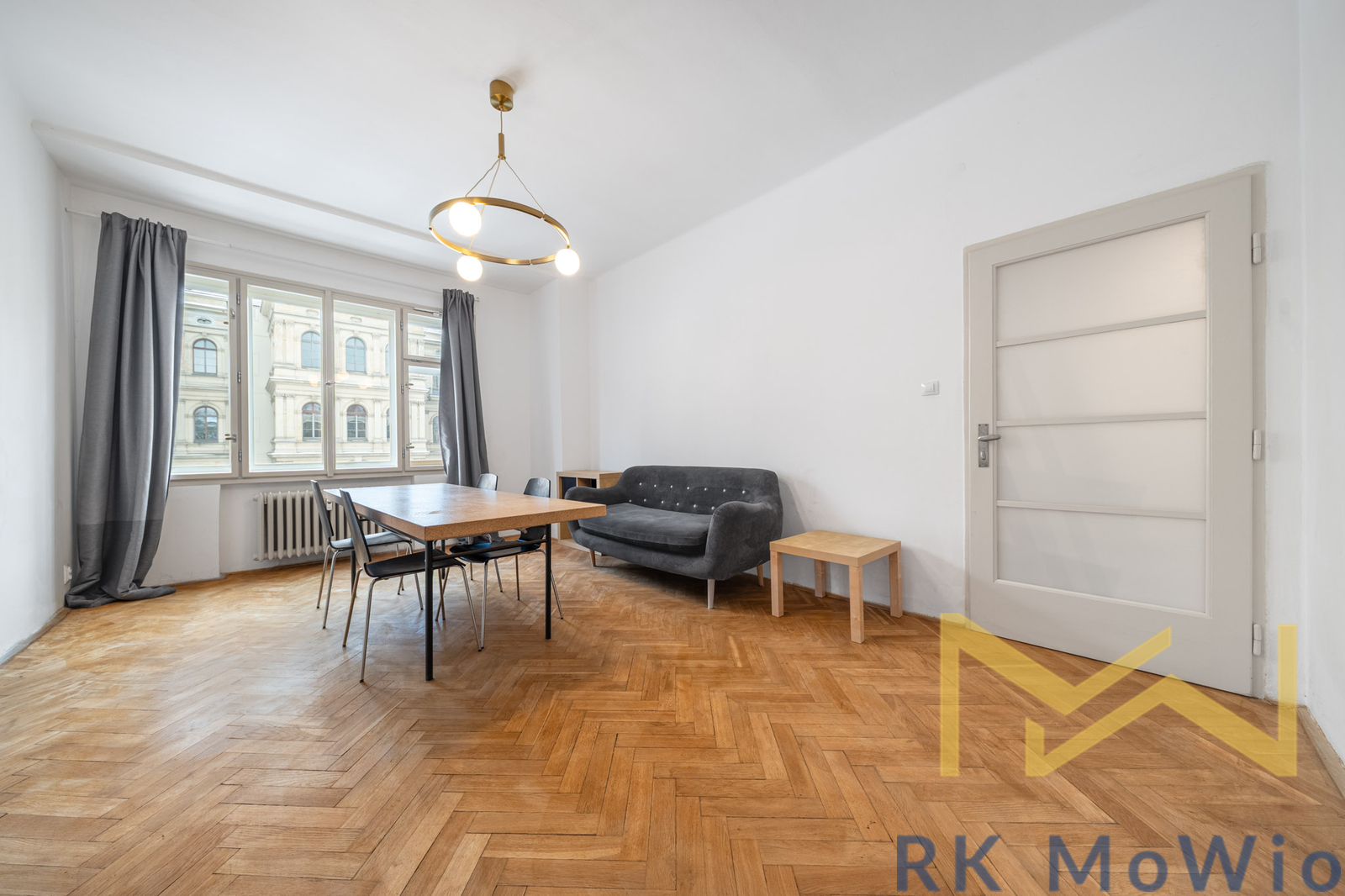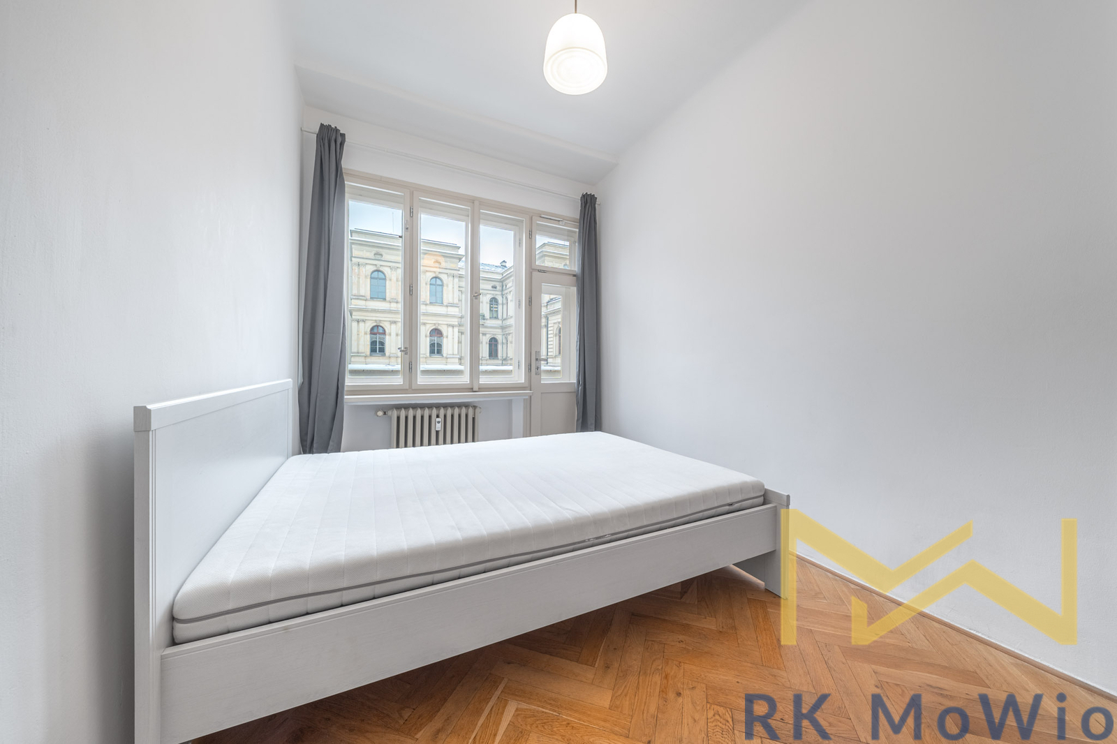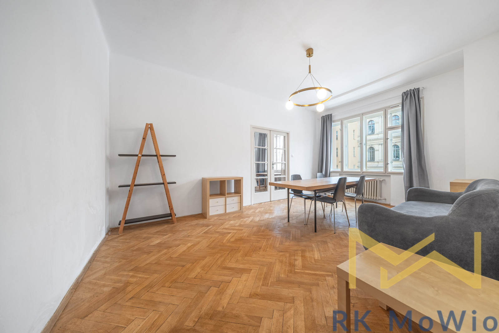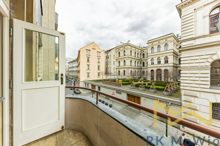For rent: a furnished 2 bedrooms apartment with a floor area of 69 sqm and a balcony of 10 sqm, situated on the 3rd floor (4th above ground level) of a classic building with an elevator on Krocínova Street in Prague 1 – Old Town.