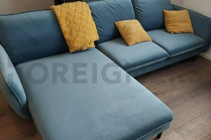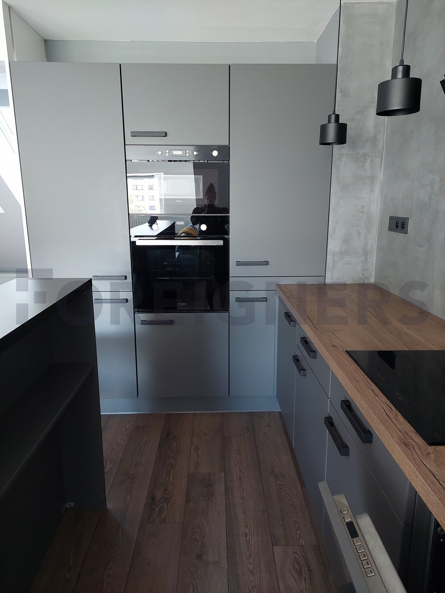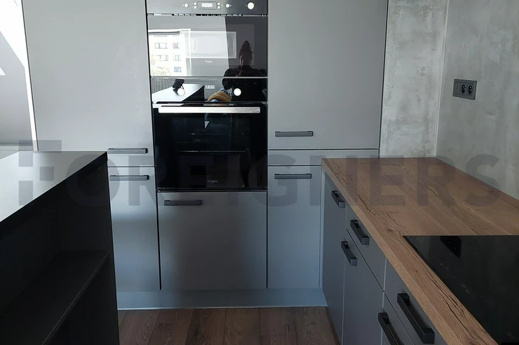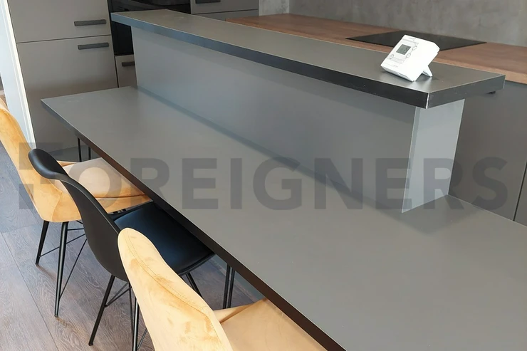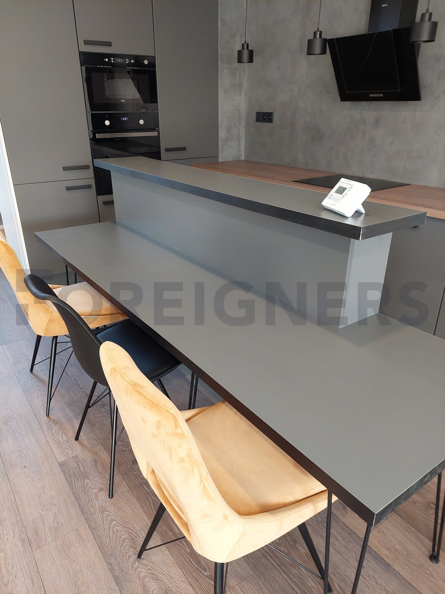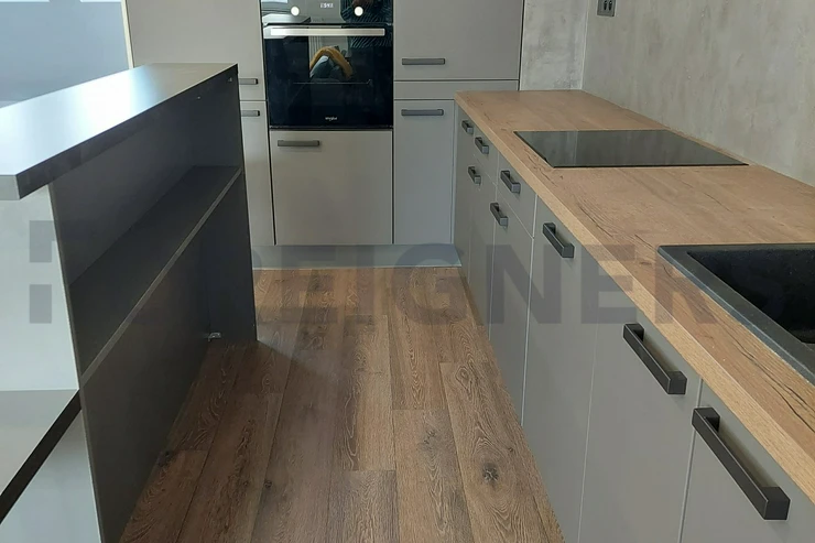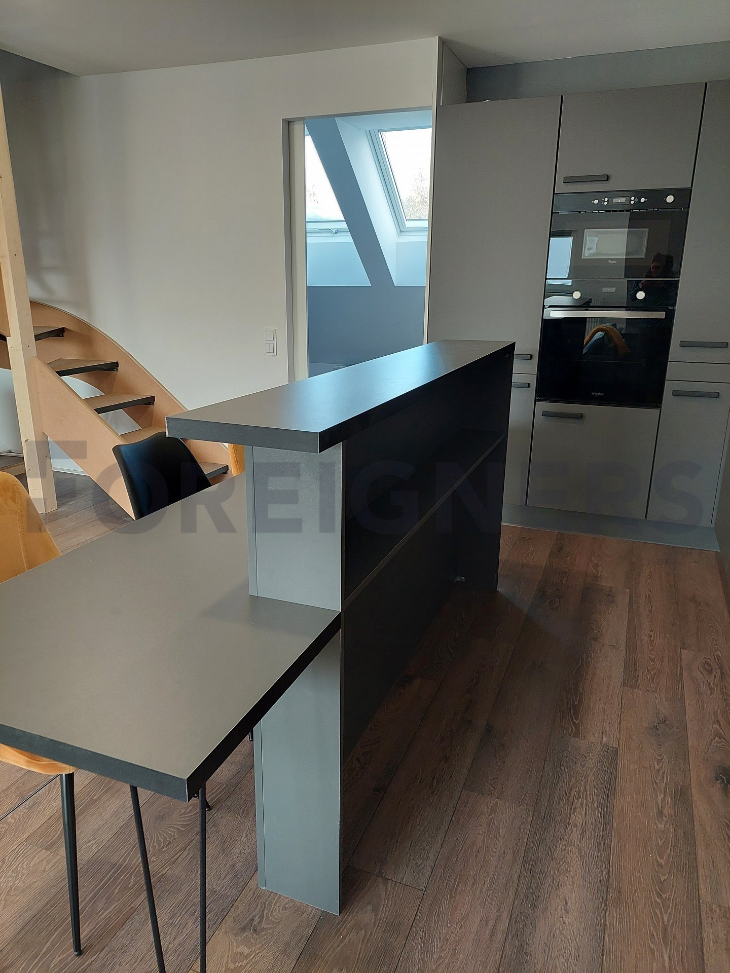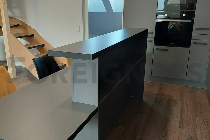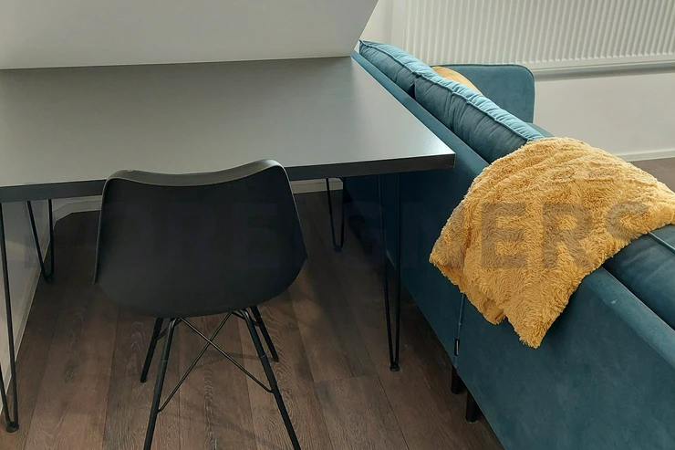 Kitchen with kitchen corner, induction with oven, fridge, freezer, microwave, hood, bar, dining table with 4 chairs. Living room with sofa with coffee table, PC table and TV table.