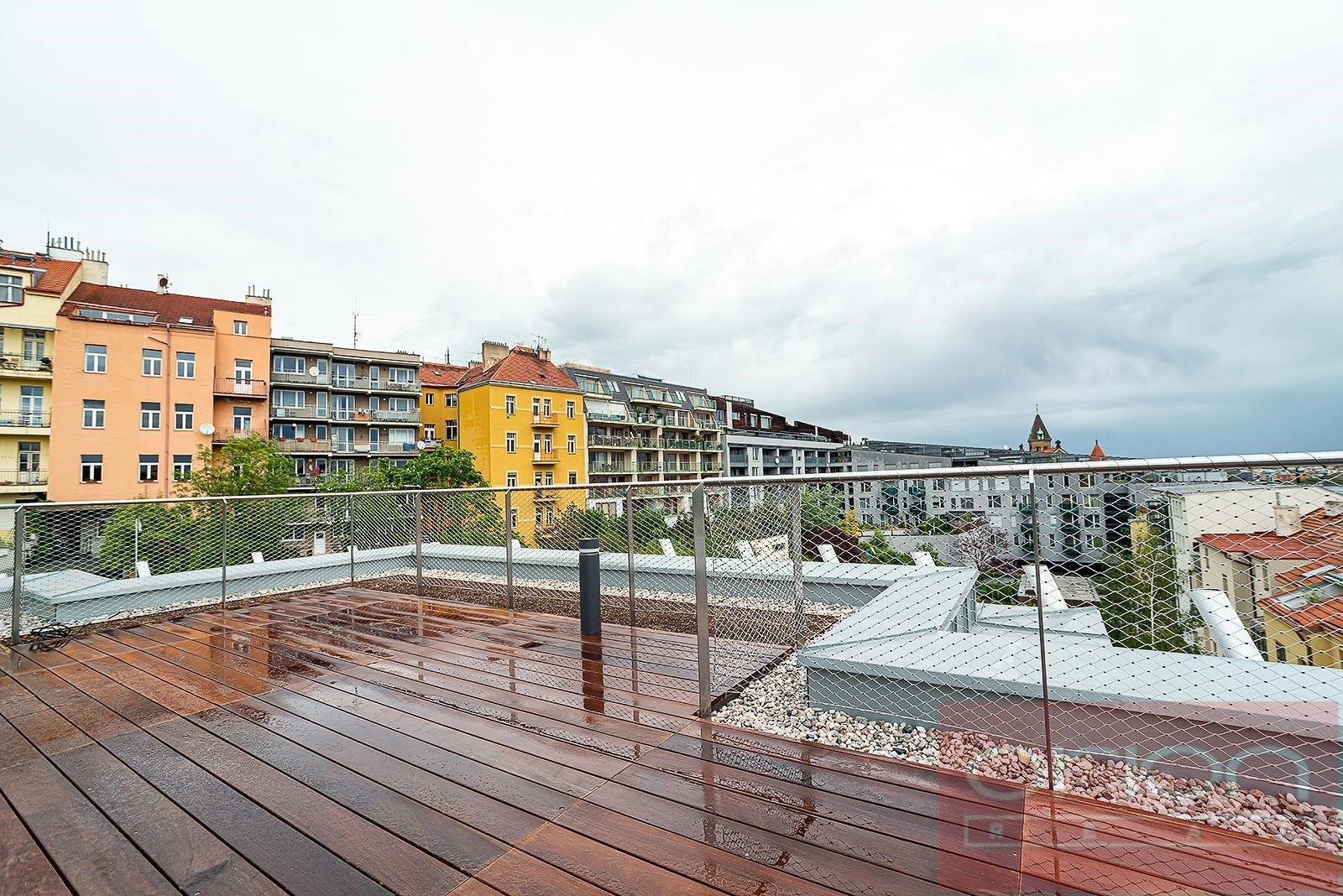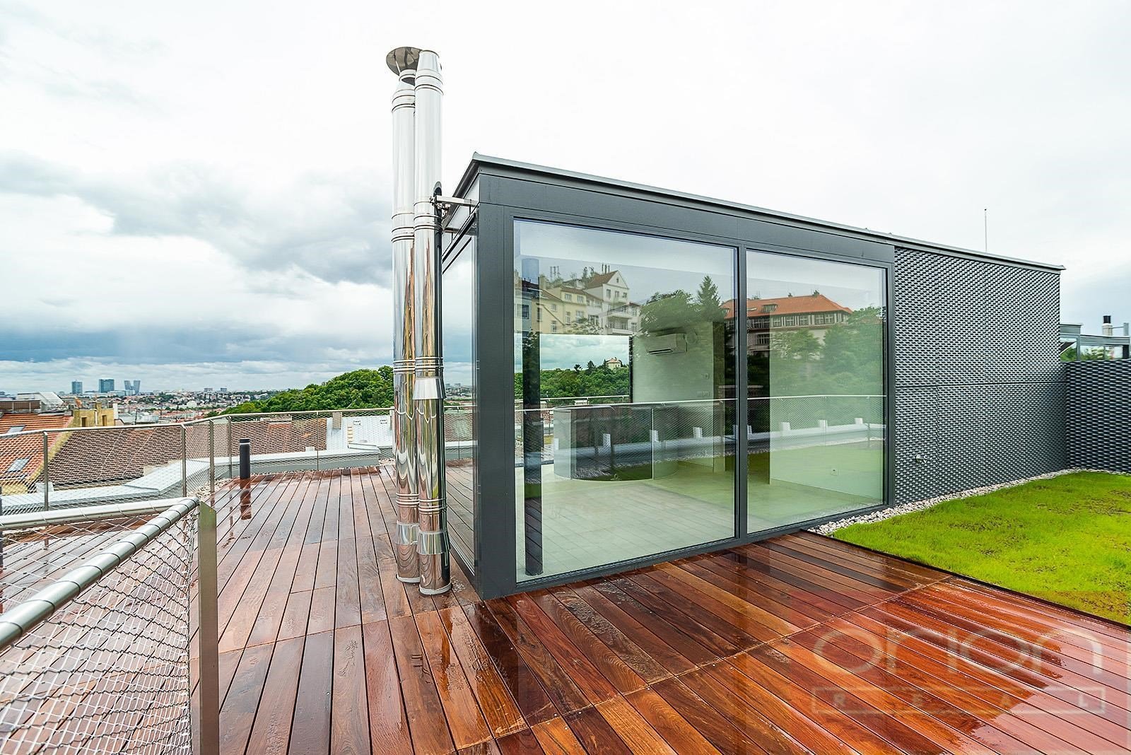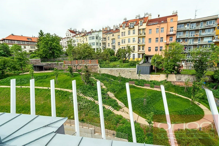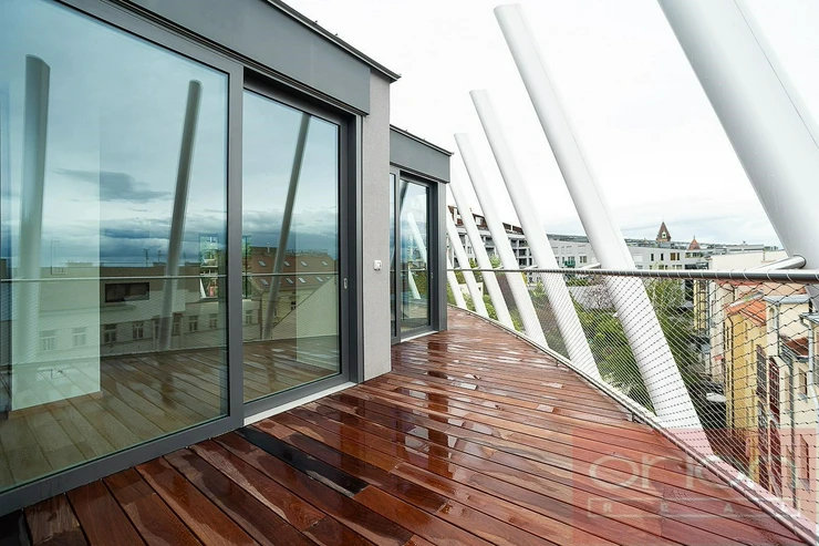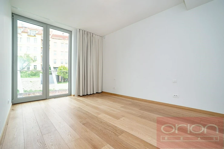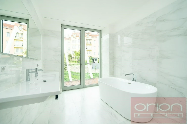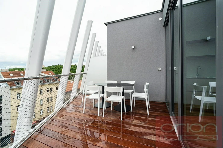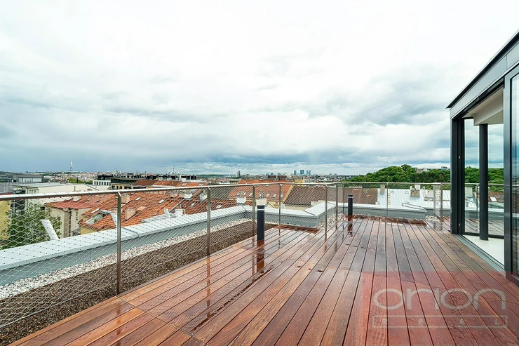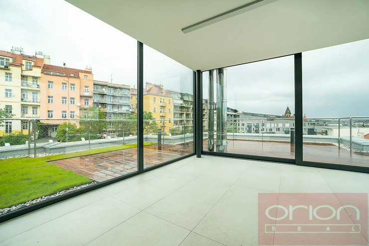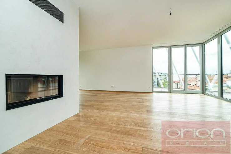 We offer for rent a luxurious three bedroom duplex apartment with three terraces and a private garden on the 5th floor of the exclusive Ellipsis Residence complex with reception, elevator, underground garage, wellness - swimming pool, sauna, and a large garden with parkland in the sought-after location of Prague 5 - Smíchov. The unfurnished apartment with a total living area of 211.7 sqm offers on the lower floor a hall, a spacious living room with a fireplace connected to the dining room and a fully equipped kitchen and with access to a terrace with a beautiful view, 3 bedrooms with access to the terrace, 2 bathrooms with a bathtub, shower, toilet, bidet (one bathroom is accessible from the bedroom), a guest toilet, a hallway and a laundry room. On the upper floor there is an open gallery (possibly a 4th bedroom) with a private wellness with sauna, a bathroom and access to a roof terrace with a garden (31 sqm). The apartment is equipped with high-quality oak floors, large-format tiles, French windows, security doors, internet, air conditioning, washing machine, dryer. The apartment has a cellar. Rent 5,400 EUR payable in euros + fees 150 CZK/m2 of the apartment + 21% VAT + extra membership fee 2,500 CZK/person/month for using the Wellness with an indoor pool and sauna directly in the apartment project. Possibility of renting a garage space for a fee of 230 EUR + 21% VAT/month. Popular location Prague 5 - Smíchov with excellent transport connections, within walking distance of the Anděl metro and tram station, the Nový Smíchov shopping center, the German and French schools. By car, close access to the Prague Ring Road and the highway network.