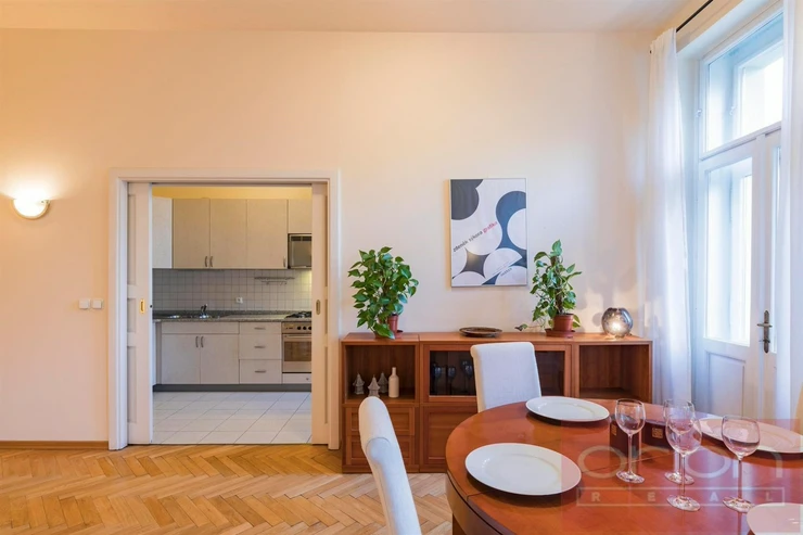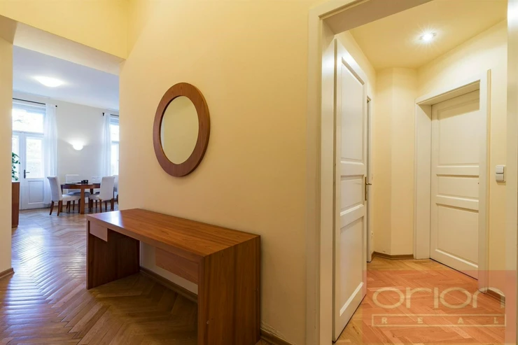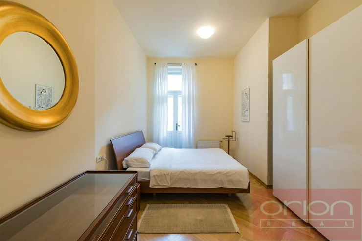 We offer for rent a furnished two bedroom - two bathroom apartment with a balcony on the 3rd floor of the a renovated apartment building in a beautiful location Vinohrady, right next to Riegrovy sady park. The apartment has living area 105sqm and an offers entry hall, a fully fitted kitchen, a spacious living room with a dining area and with entrance balcony, two bedrooms - one bedroom with a balcony and en-suite bathroom with a tub, a bidet and a toilet, the second bathroom with a shower, a toilet and a bidet, a laundry room with a washing machine and a dryer. The tenants have a shared garden for common using. Parquets and tiles floors. Very nice location, nearby are cafes, shops and the metro station Naměstí Míru, náměstí Jiřího z Poděbrad and Wenceslav Square. Available February 1st, 2026, viewing now up to previous agreement.