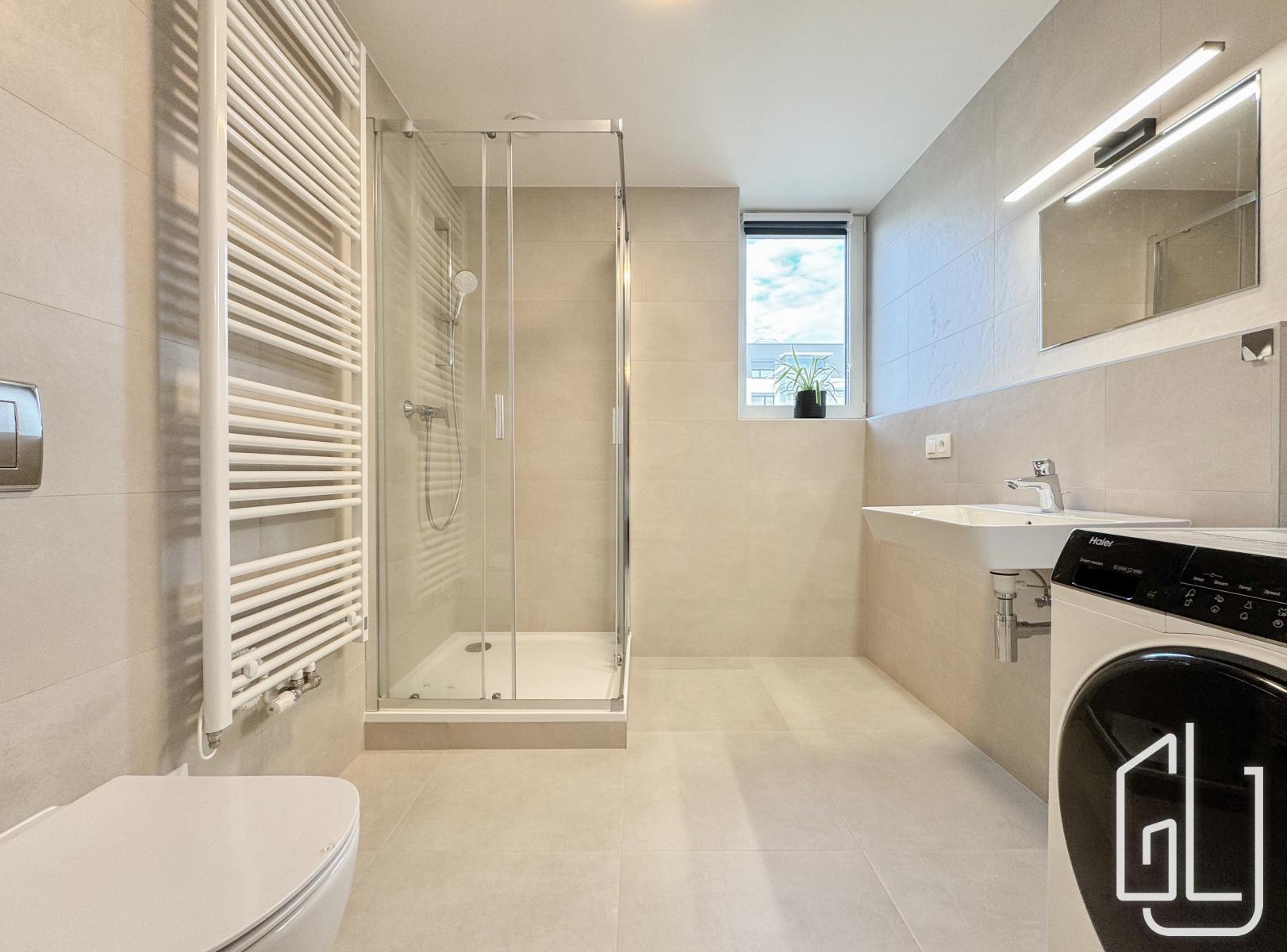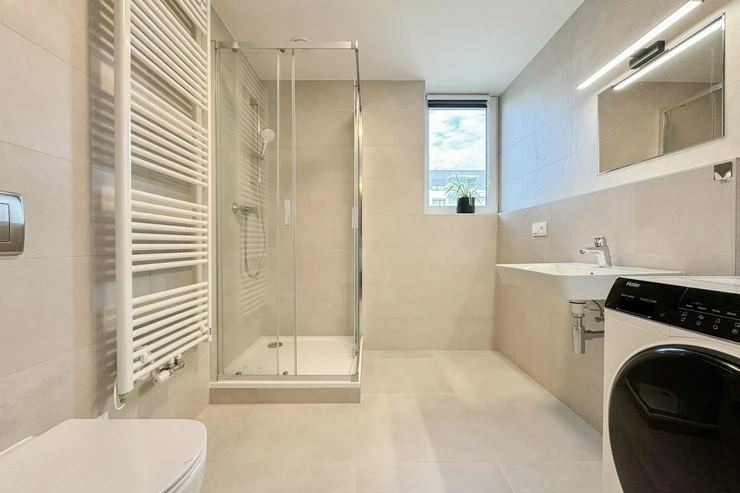 The bedroom is furnished with a double bed, a childs bed and a built-in wardrobe offering ample storage space. The bathroom features a shower, washbasin, toilet and washing machine. A major benefit of the apartment is the modern ventilation system with heat recovery, ensuring fresh air throughout the interior and offering a cooling function for comfortable temperatures during summer months.