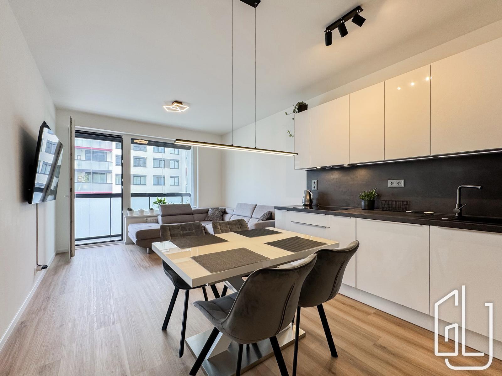 The apartment is fully furnished and ready for immediate move-in. The living area consists of a bright living room with a fully equipped kitchen featuring built-in appliances including a cooktop, oven, microwave, dishwasher and refrigerator. The kitchen is also fully equipped with kitchenware. The living space includes a dining table with chairs, a sofa and a TV.