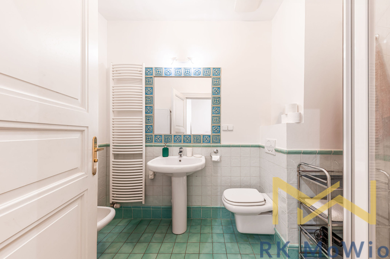 The apartment features an entrance hall, a spacious living room with a dining area, a separate kitchen, a bathroom (with bathtub, washbasin, toilet, and bidet), and a second bathroom (with shower, washbasin, toilet, and bidet). Apartment amenities include a fitted kitchen (including fridge with freezer, ceramic hob, extractor hood, dishwasher, and electric oven), built-in wardrobes, washing machine and dryer, and preparation for high-speed internet.