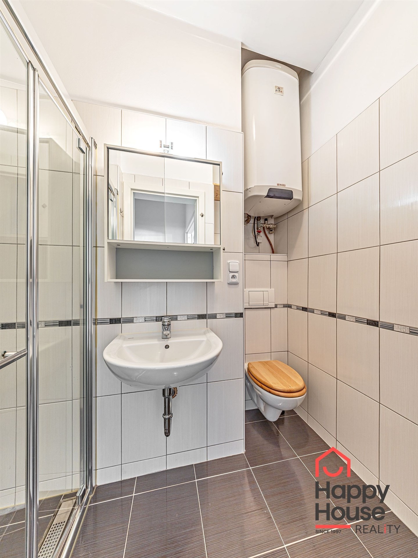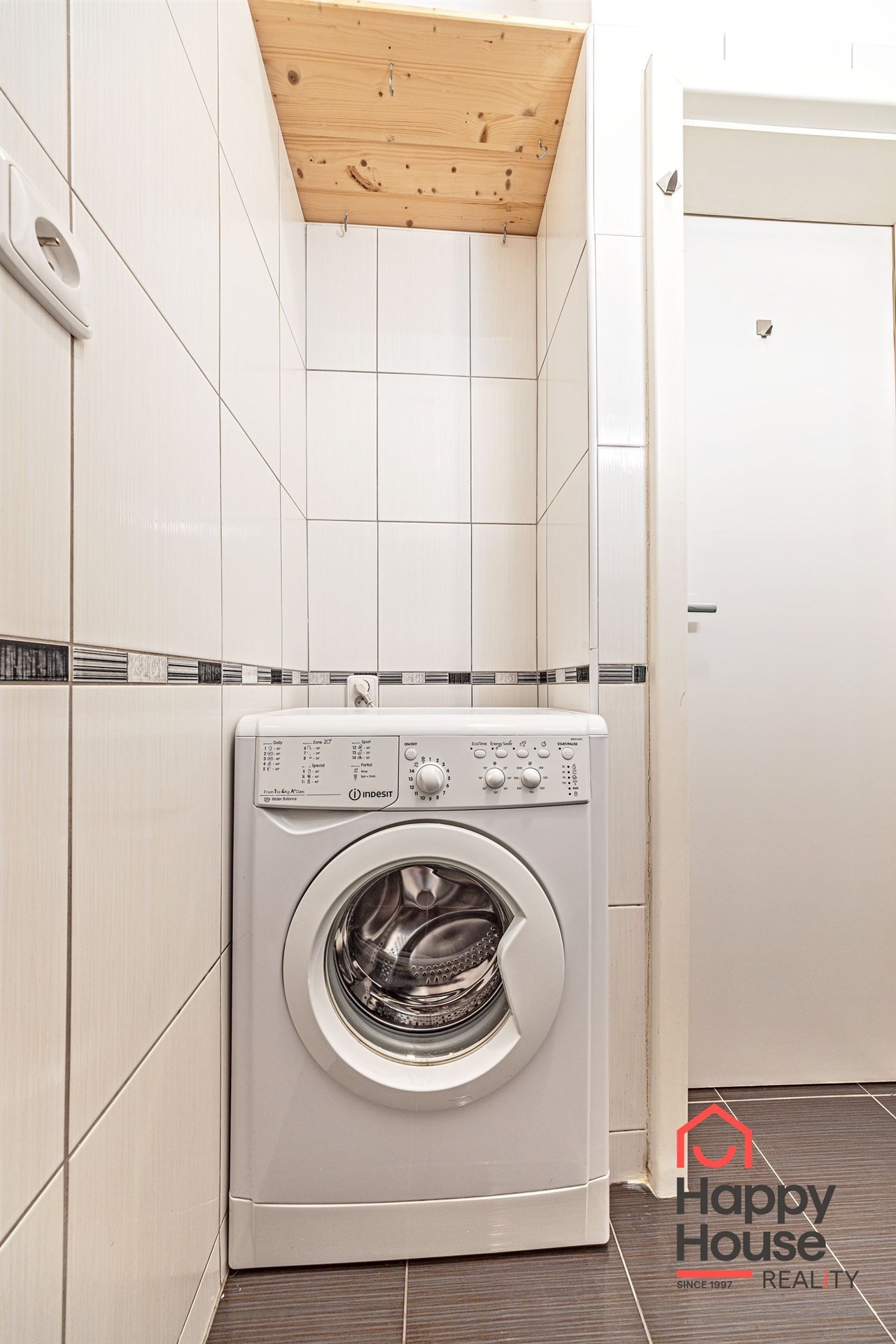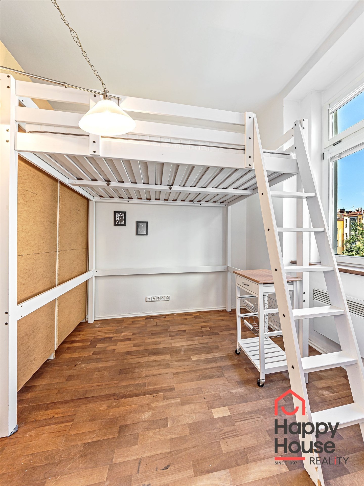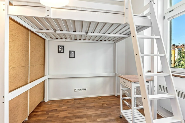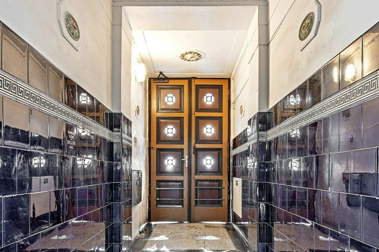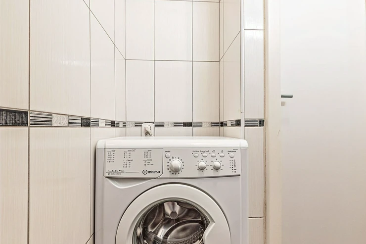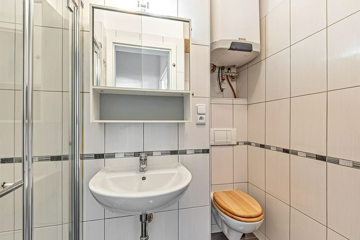The apartment is heated by electric heaters. Laminate flooring and tiles throughout. The windows offer a quiet north-west-facing view into a green inner courtyard.