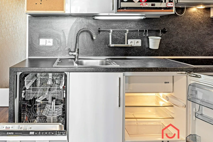 The kitchenette is equipped with a kitchen unit and built-in appliances, including a fridge with freezer, ceramic hob, convection oven, microwave oven, dishwasher, and extractor hood.