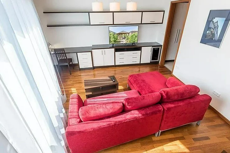 The living room is furnished with modern furniture, a comfortable sofa bed, a wine cellar and a work desk. The bedroom has a quality bed with anatomical mattresses and blackout curtains for a peaceful sleep.